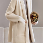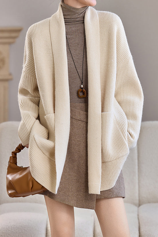 | Product details | Cardigan without collar, long sleeves, loose long fit, featuring a no-button design at the front with two patch pockets |