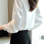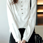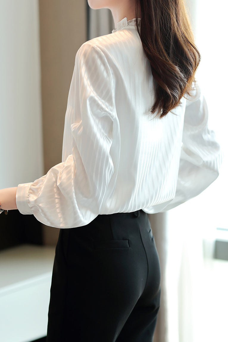 | Product details | Shirt with ruffled round neck, long sleeves, loose fit, featuring subtle vertical stripes, with non-sheer lace and decorative buttons on the chest, and a button closure at the back of the neck |