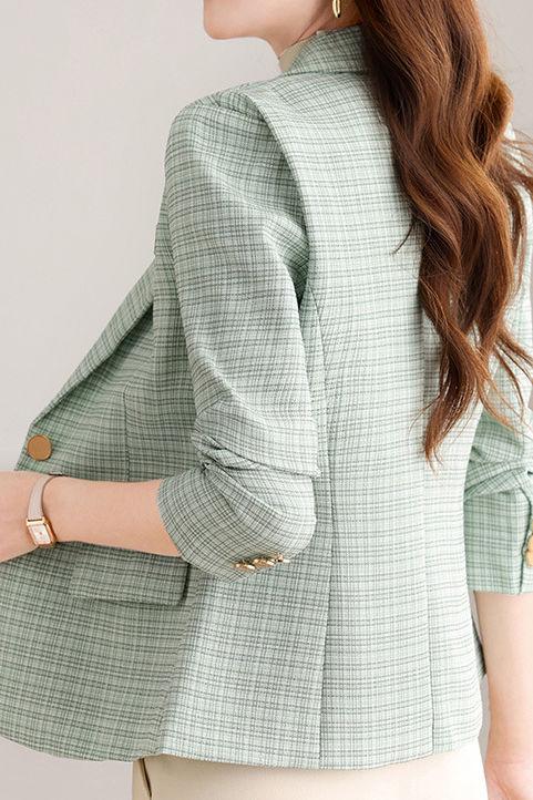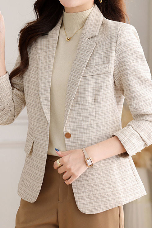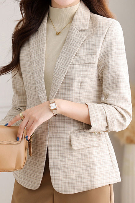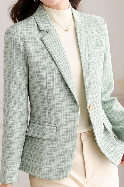 Suit jacket,suit collar long-sleeve loose fit,front center with openable single-button design,full-body solid-color plaid,two side pockets with pocket tabs design on both sides,cuffs with decorative cufflinks |
