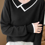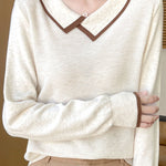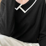Knitted top,lapel long-sleeve loose fit,asymmetric color-block bound lapel and color-block cuff design,body and sleeve paneling with different texture feelings |