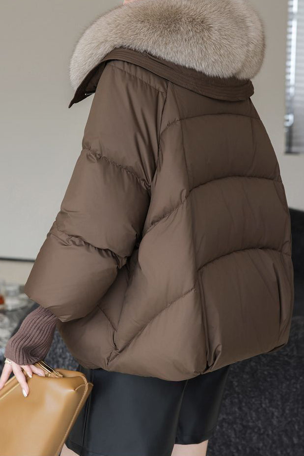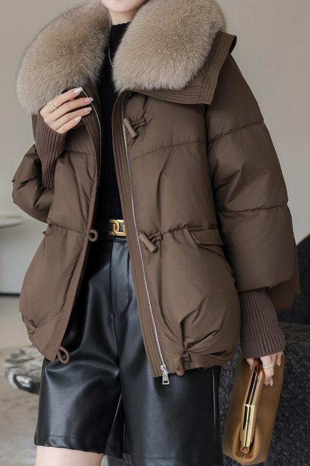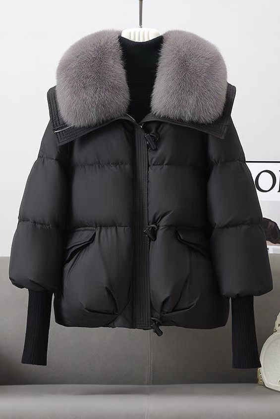Cotton-padded coat,lapel long-sleeve loose fit,collar with buttons for fixing detachable fur collar,front center with openable zipper,two decorative pocket tabs on both sides |