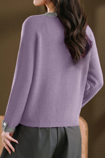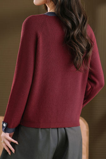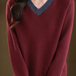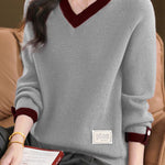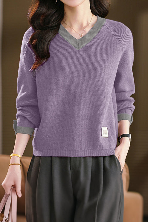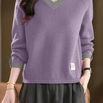 Casual Versatile V-Neck Long-Sleeve Color-Block Knitted Top