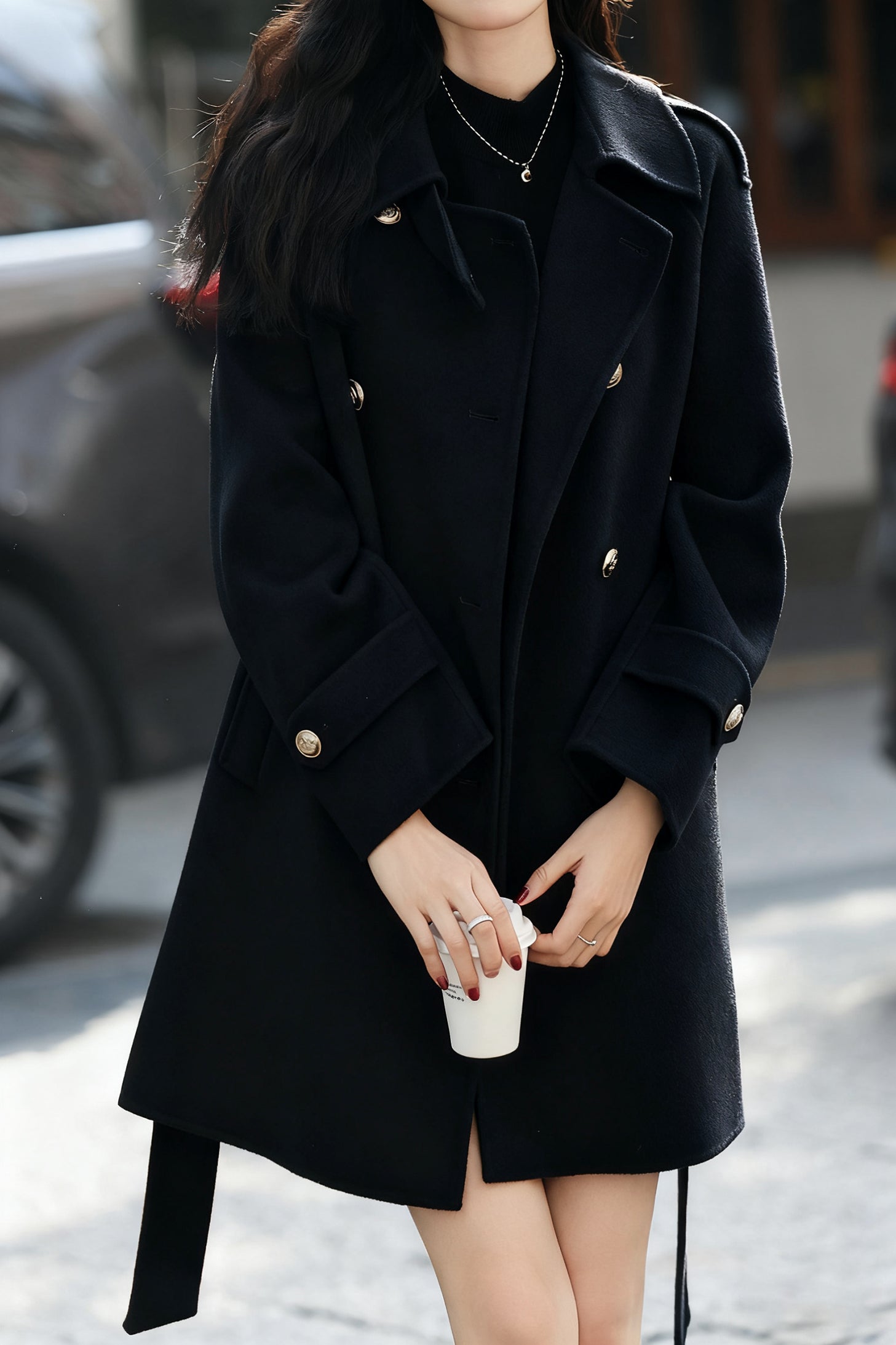 Woolen coat,solid color, lapel long-sleeve loose fit,double-breasted button design,left and right side pockets on front panel,comes with same-color belt as the body |