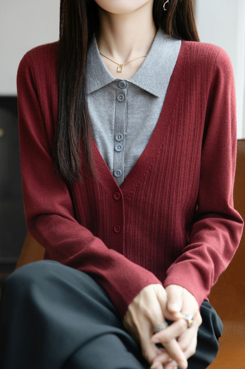 Casual Minimalist Fake Two-Piece Color-Block Shirt Collar Knitted Cardigan