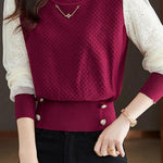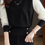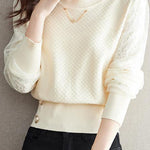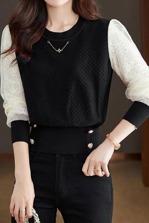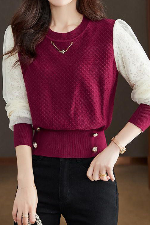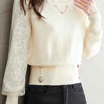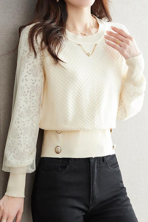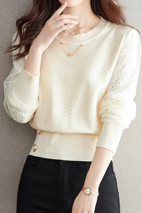 Elegant Temperament Lace-Paneled Pullover Long-Sleeve Knitted Top