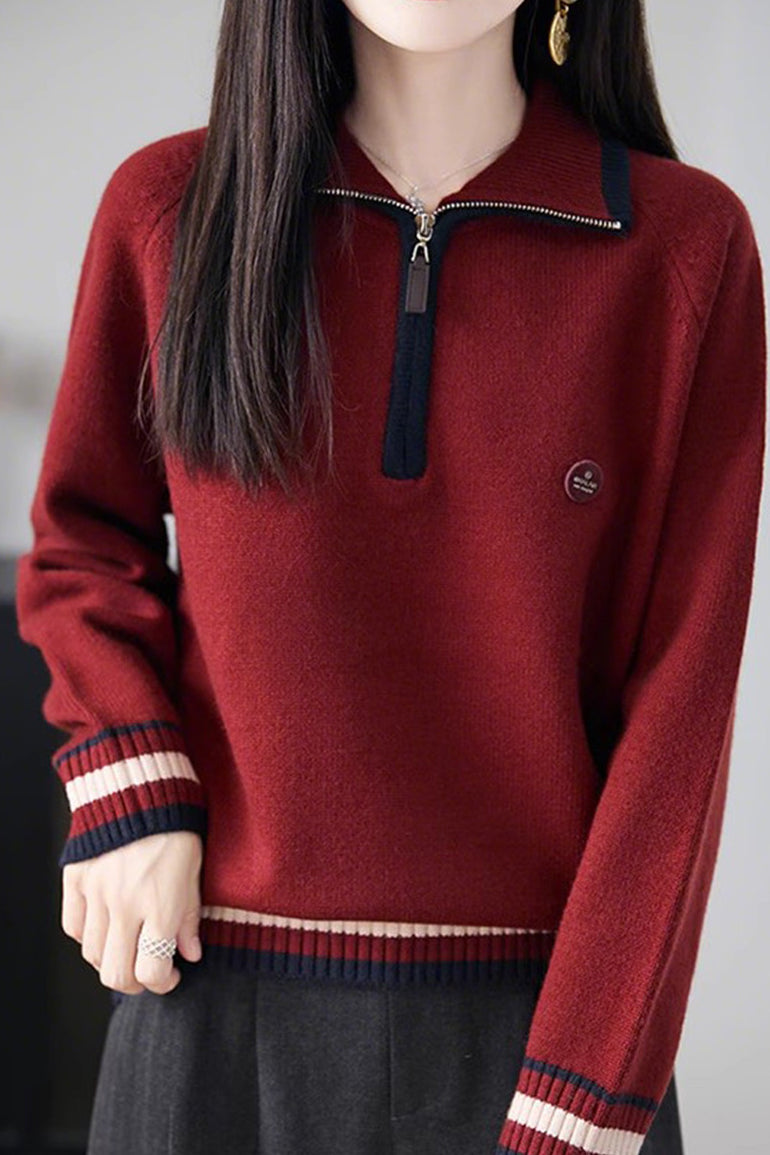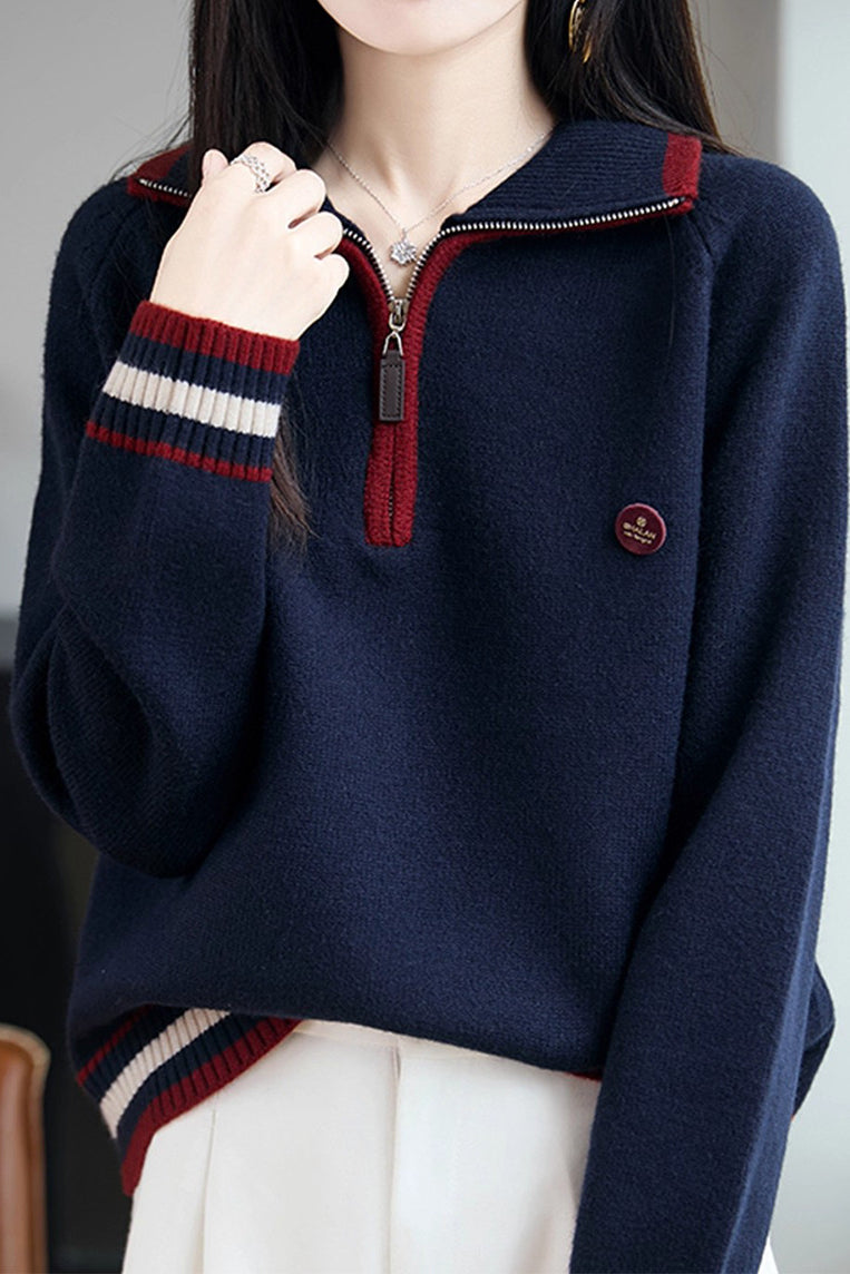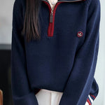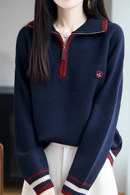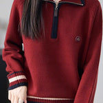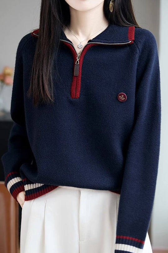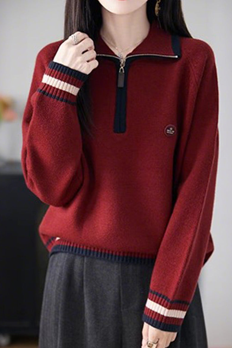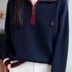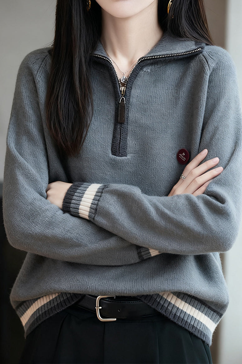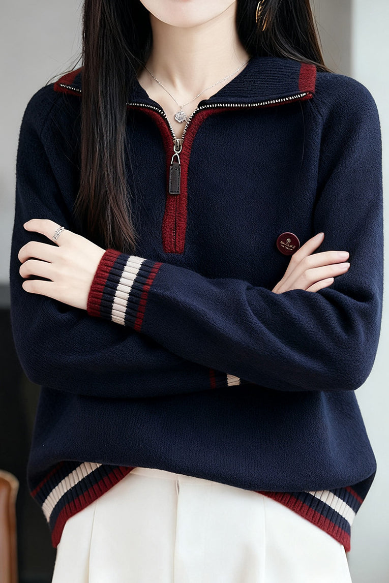 Knit Top with half-zip neck design, contrasting striped decorations at the cuffs, and small decorative embellishment on the body, made from soft and delicate knit fabric, with a loose comfortable fit |