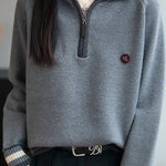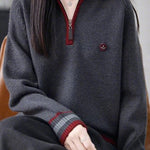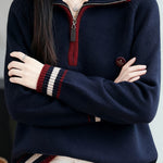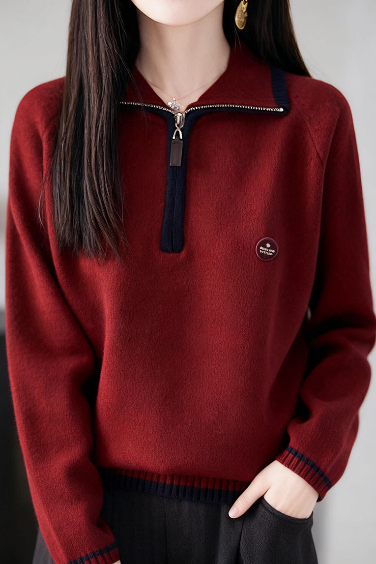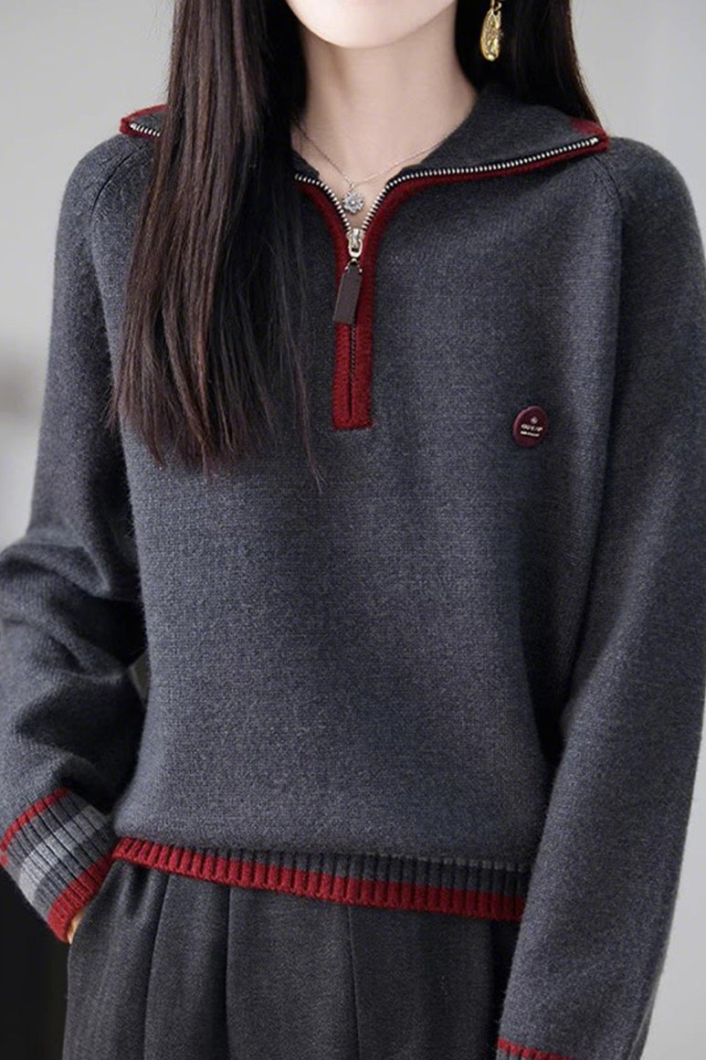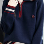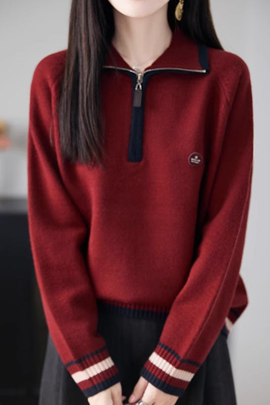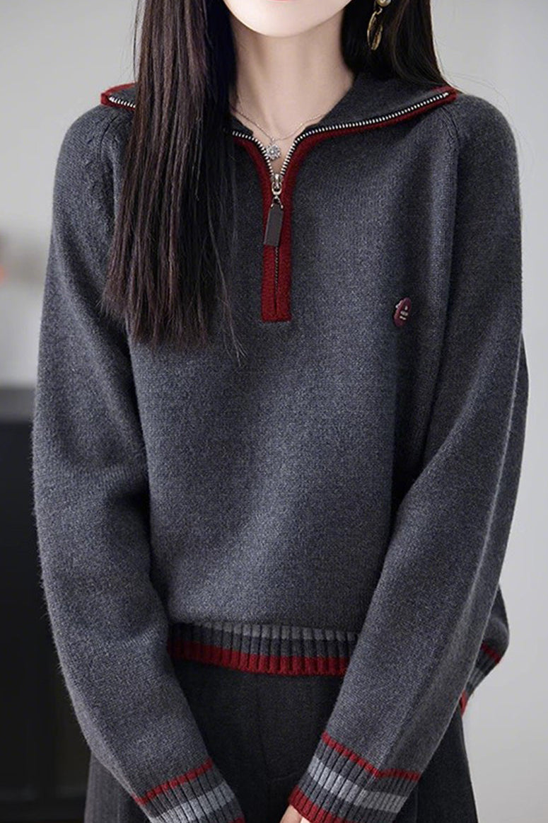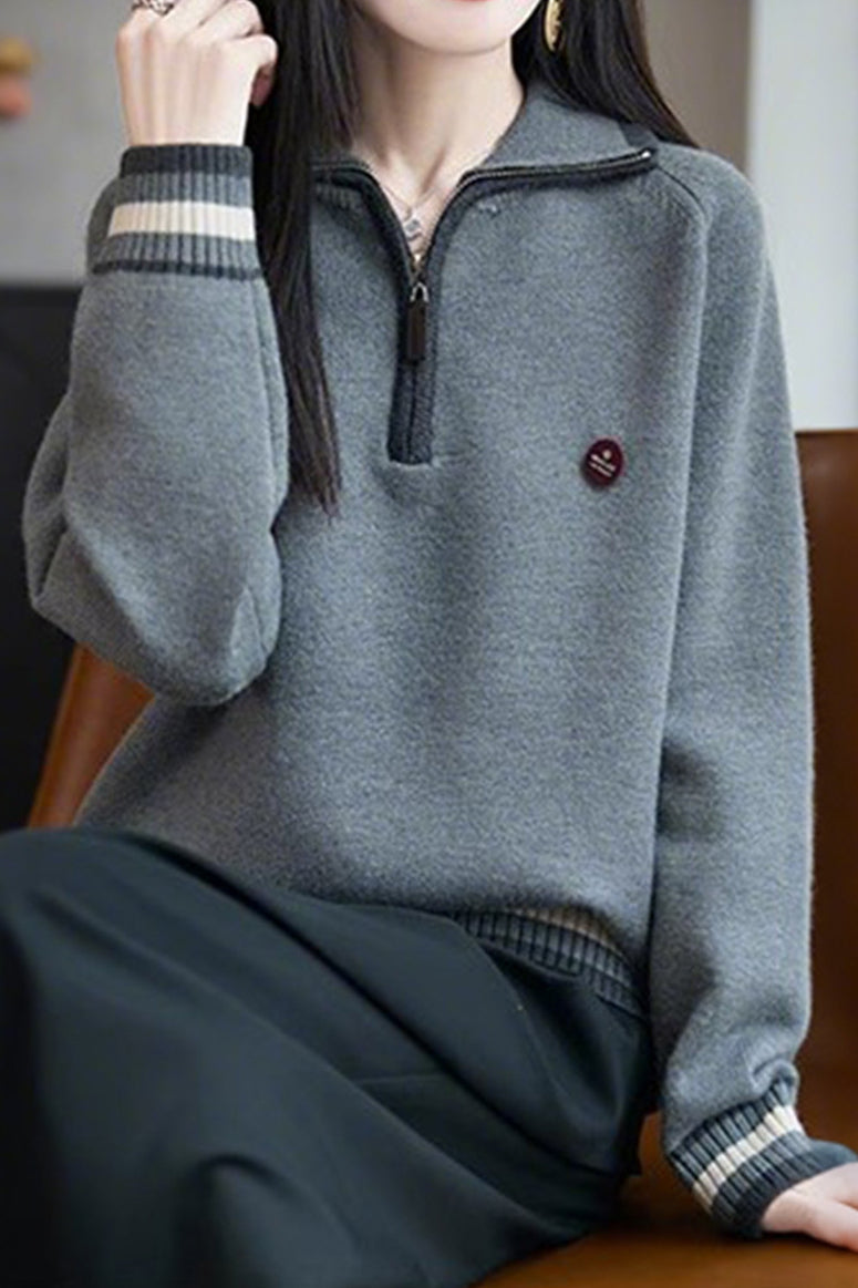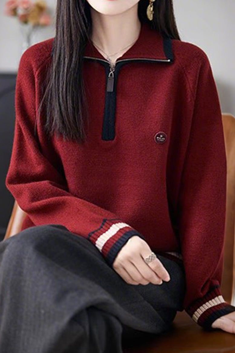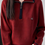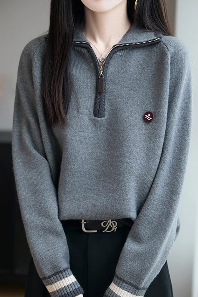 Knit Top with half-zip neck design, contrasting striped decorations at the cuffs, and small decorative embellishment on the body, made from soft and delicate knit fabric, with a loose comfortable fit |