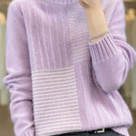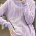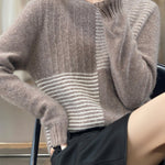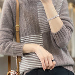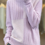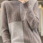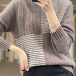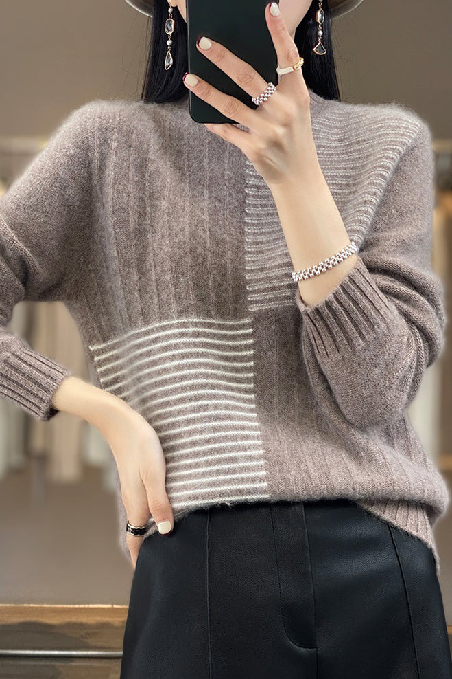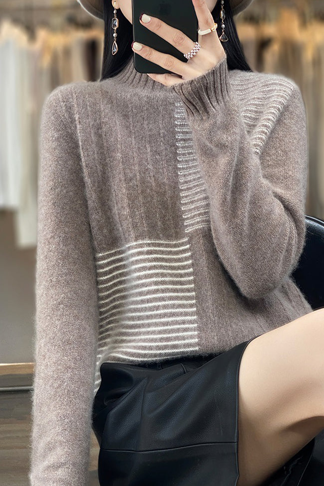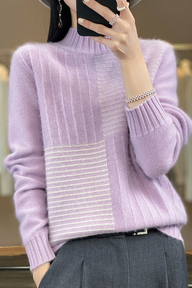 Knit Top with a half-high neck, featuring textured patchwork and striped detailing for added depth, made from soft and fluffy knit fabric, with a loose comfortable fit |