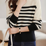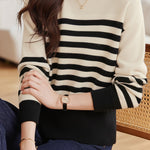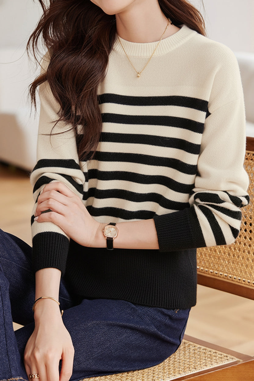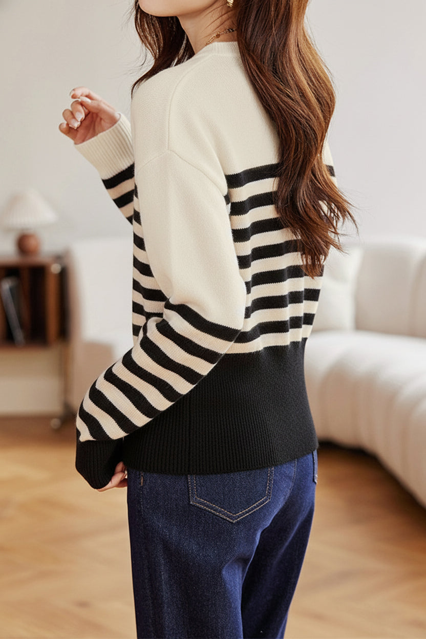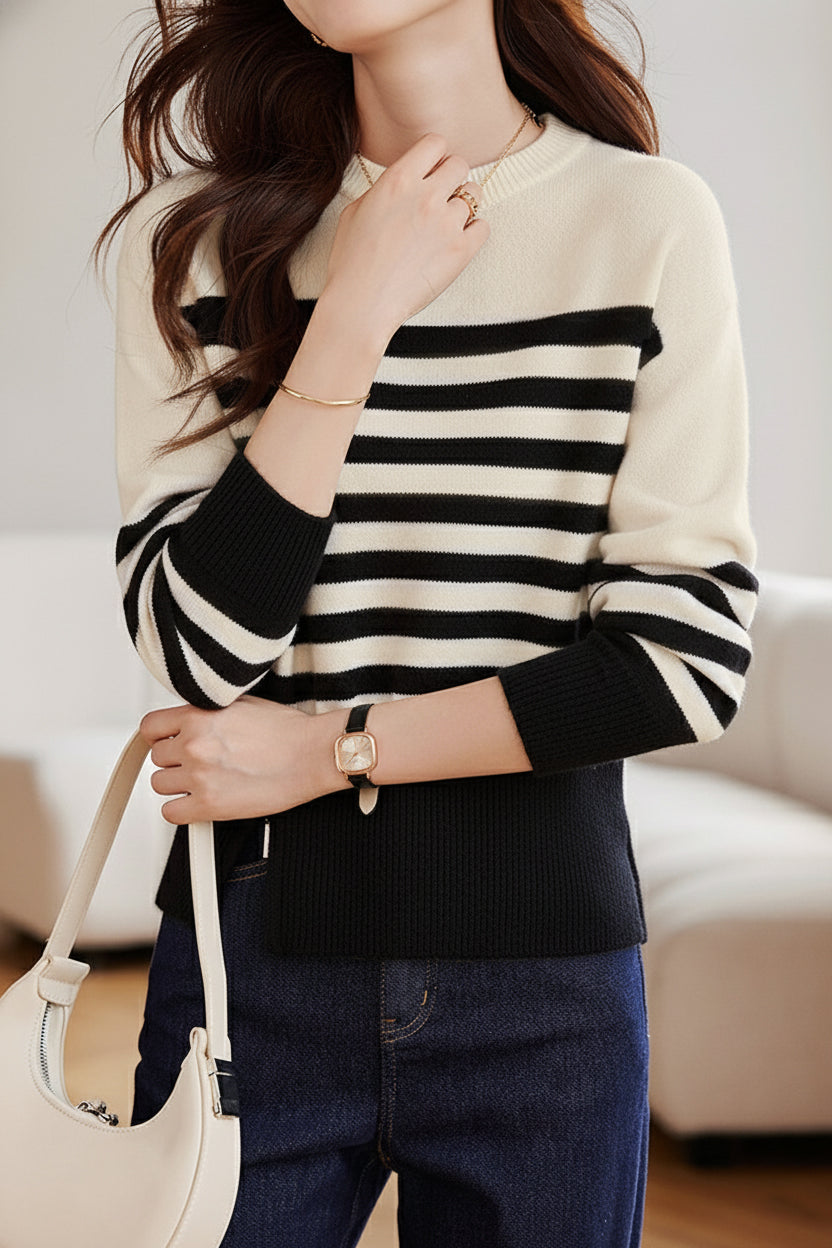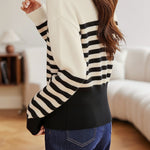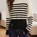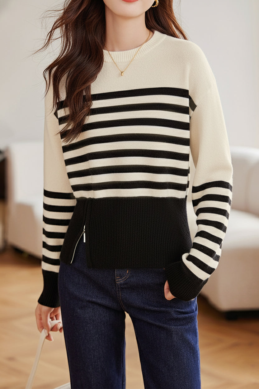 Pullover Sweater with a round neck, long sleeves, and a loose fit, featuring a half-high zipper design on the right front hem for styling, made from large color-block and horizontal stripe design |