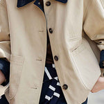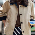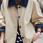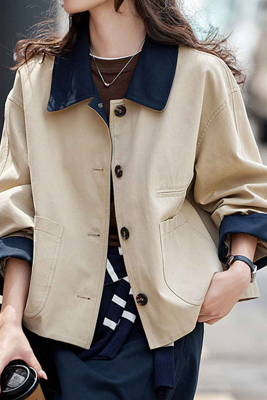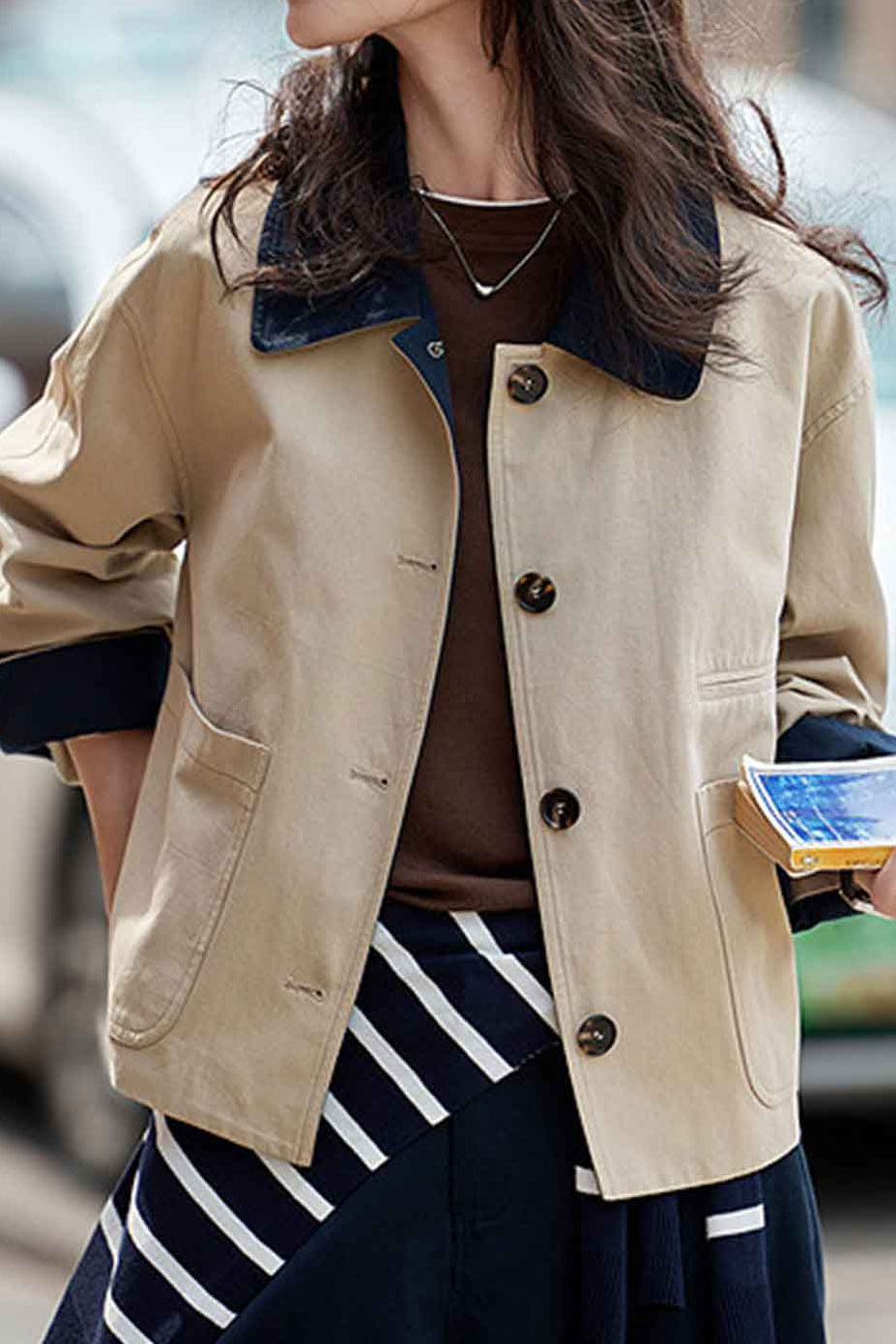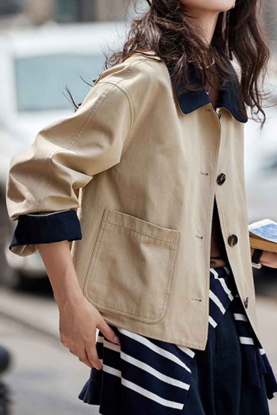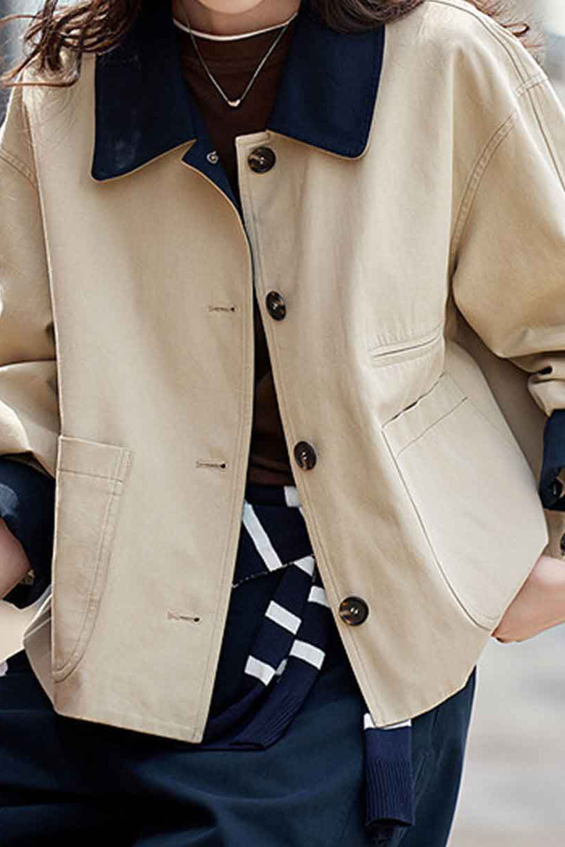 Coat, lapel color-block design, single-breasted button closure for simple neatness, cuffed sleeves for layering effect, loose and casual body version, structured and stylish fabric |