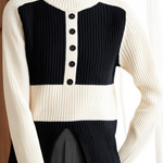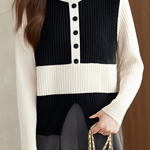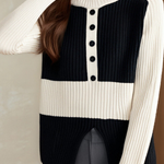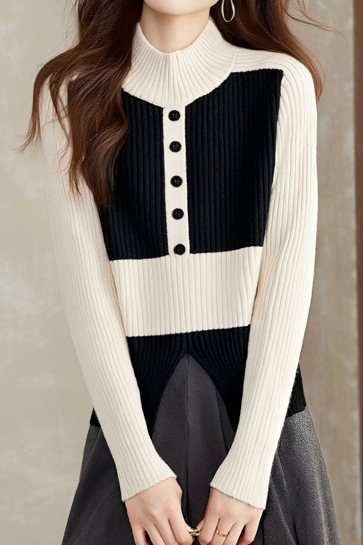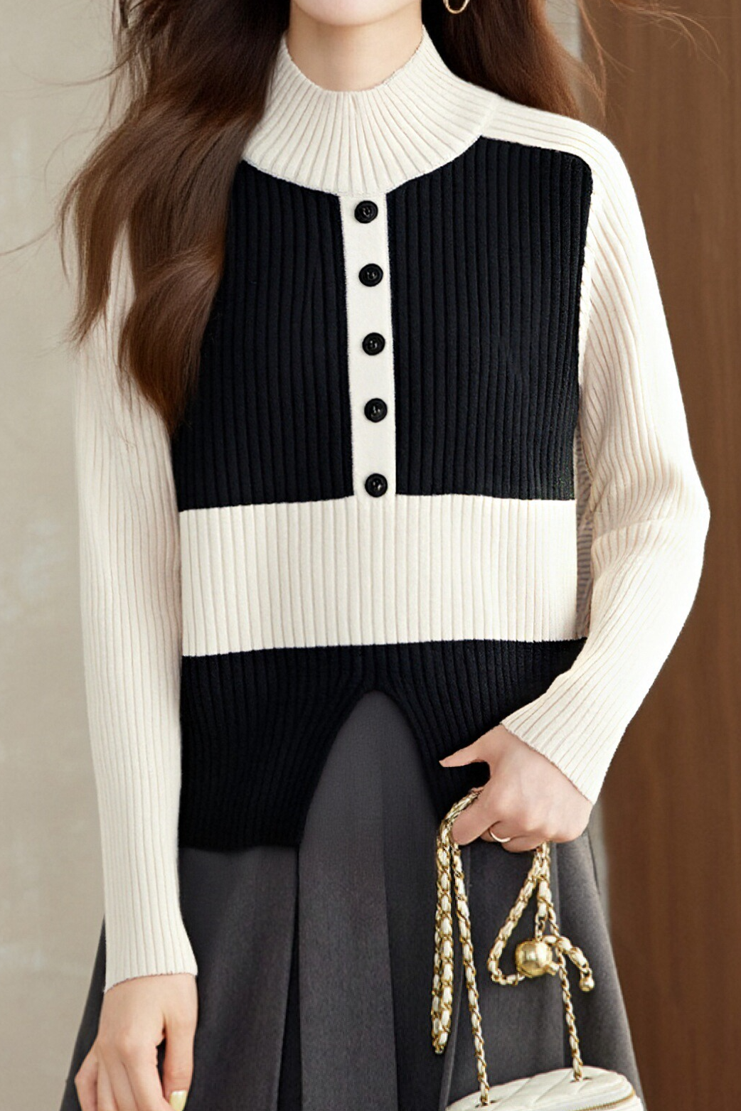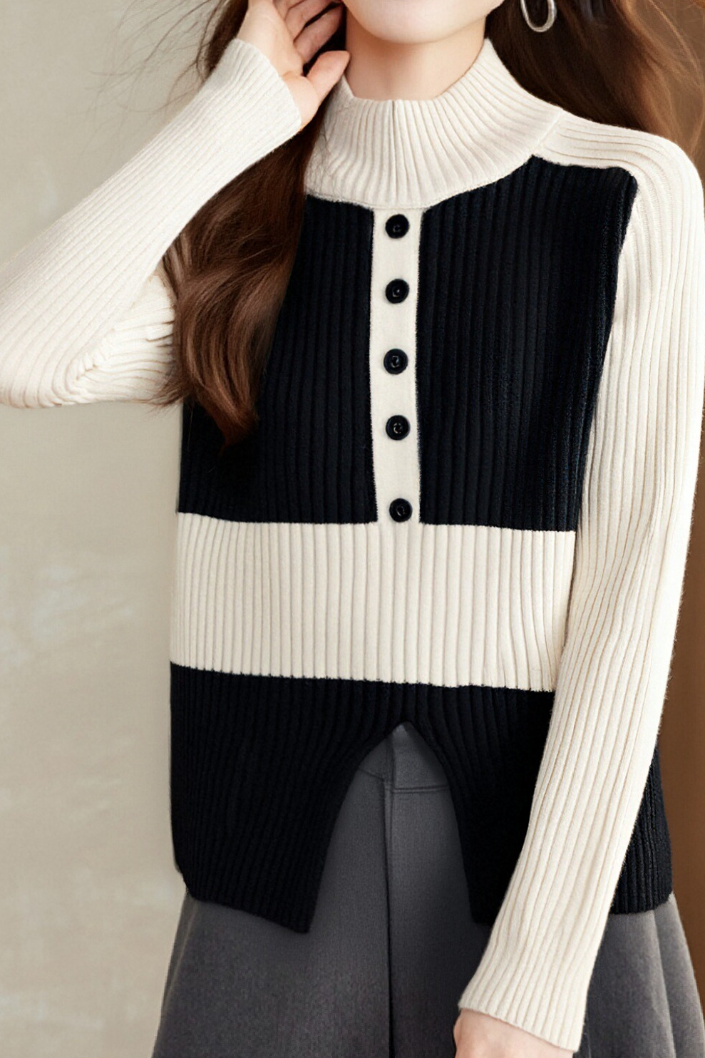 Casual Versatile Black-White Color-Block Slit Turtleneck Sweater