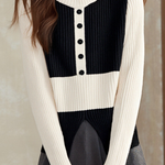 Pullover sweater, high-neck raglan long-sleeve loose fit, front center with non-openable decorative placket buttons, body with large-area black-white color-block design from raglan seams, hem with slit design |