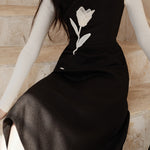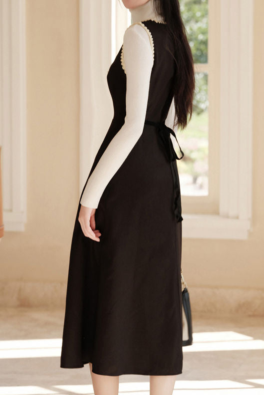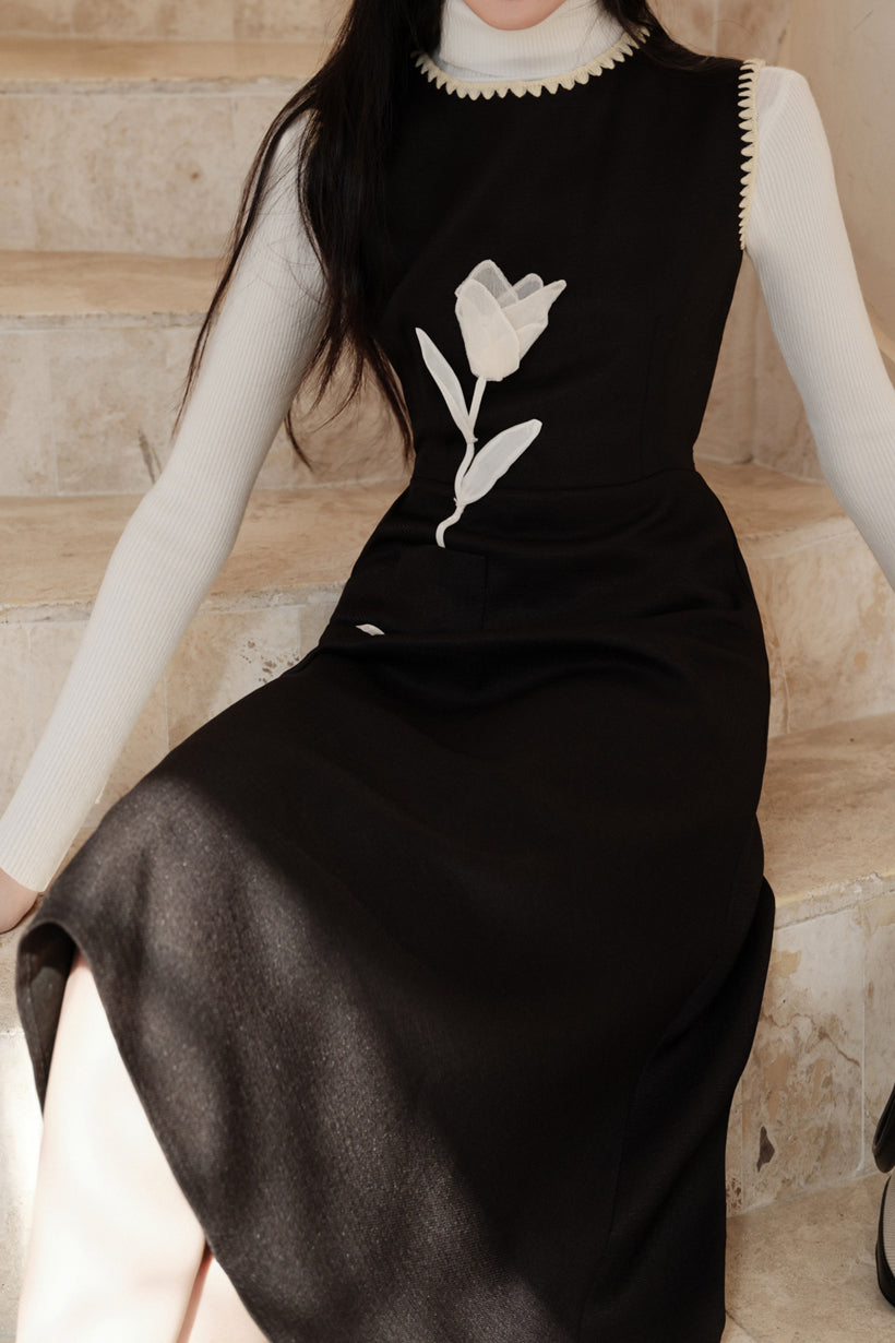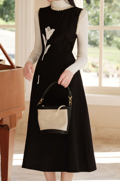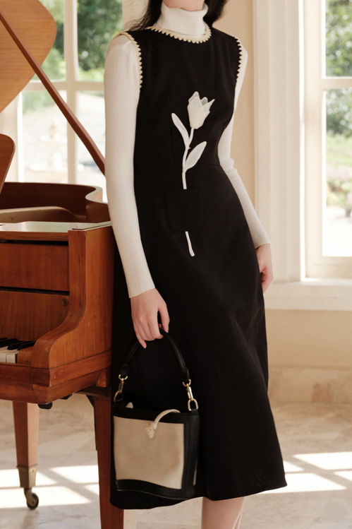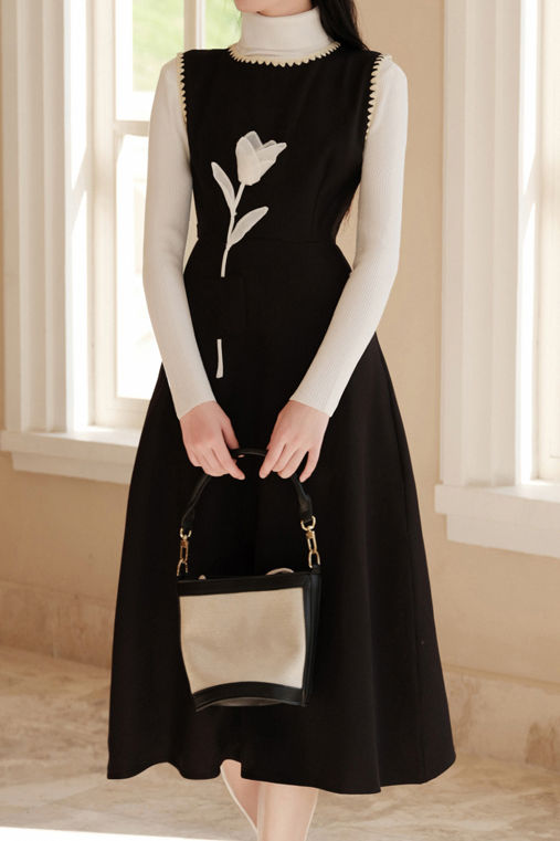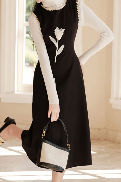 Vest midi skirt and base layer two-piece set, paneled design, neckline with lace trim decorations, body embroidered with 3D patterns for refinement, soft and drapey fabric |
