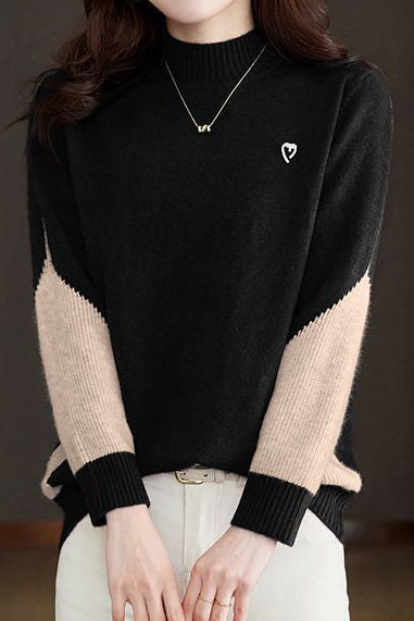 Pullover sweater, half-high neck long-sleeve loose fit, body and sleeves with color-block design, chest with pin decoration |