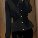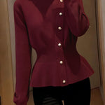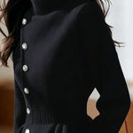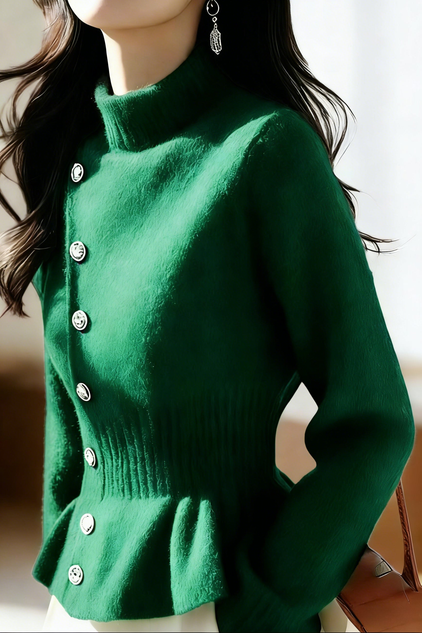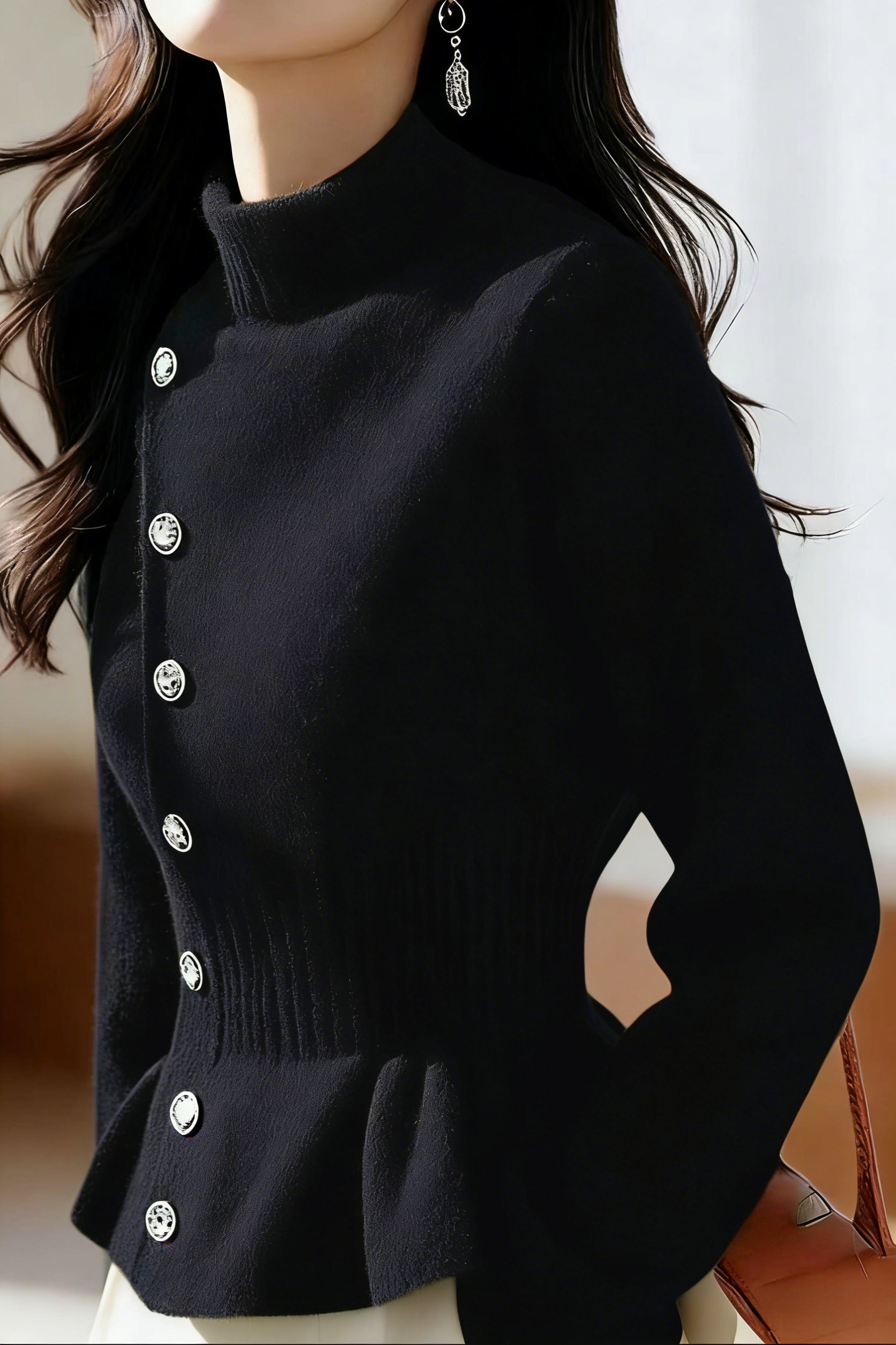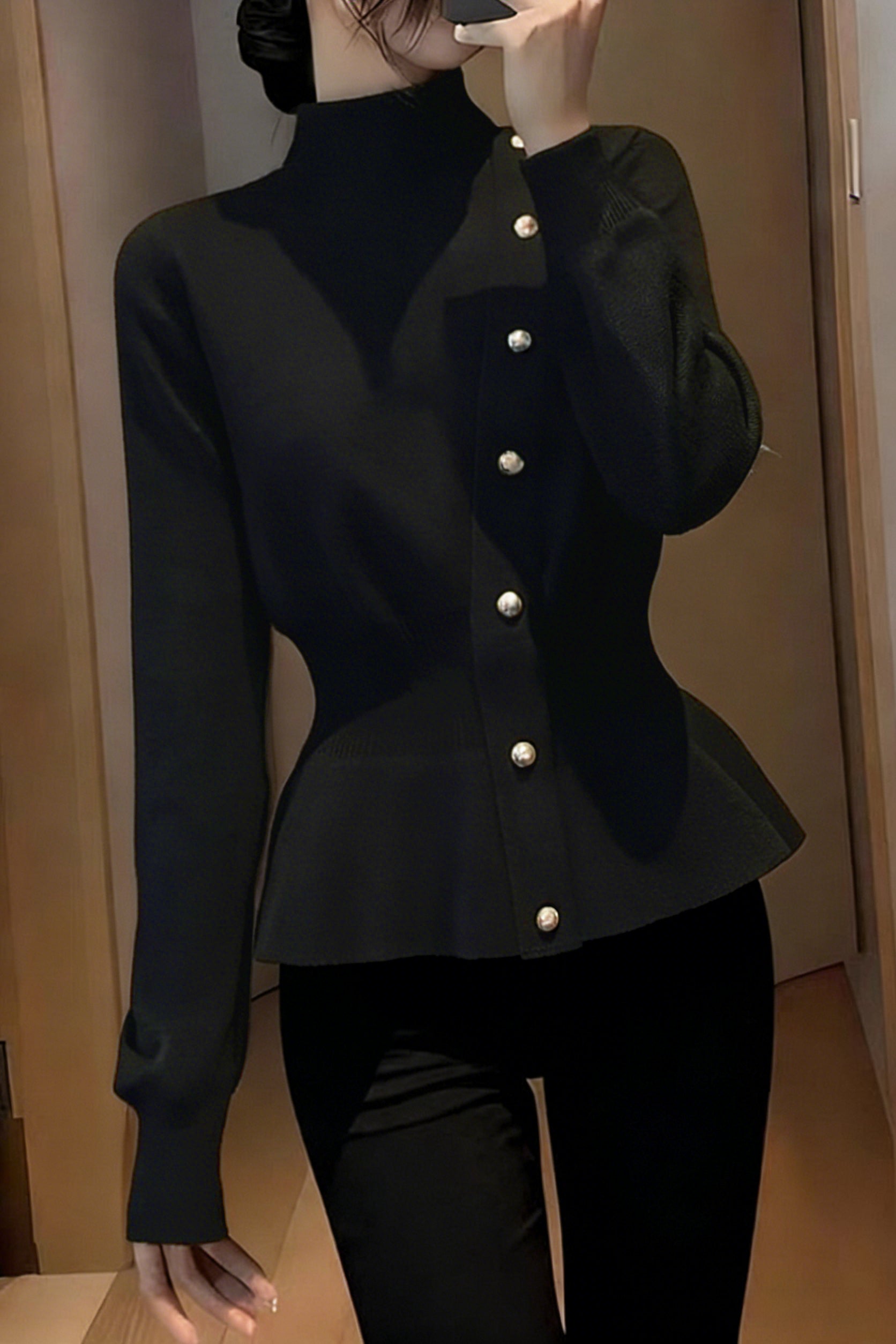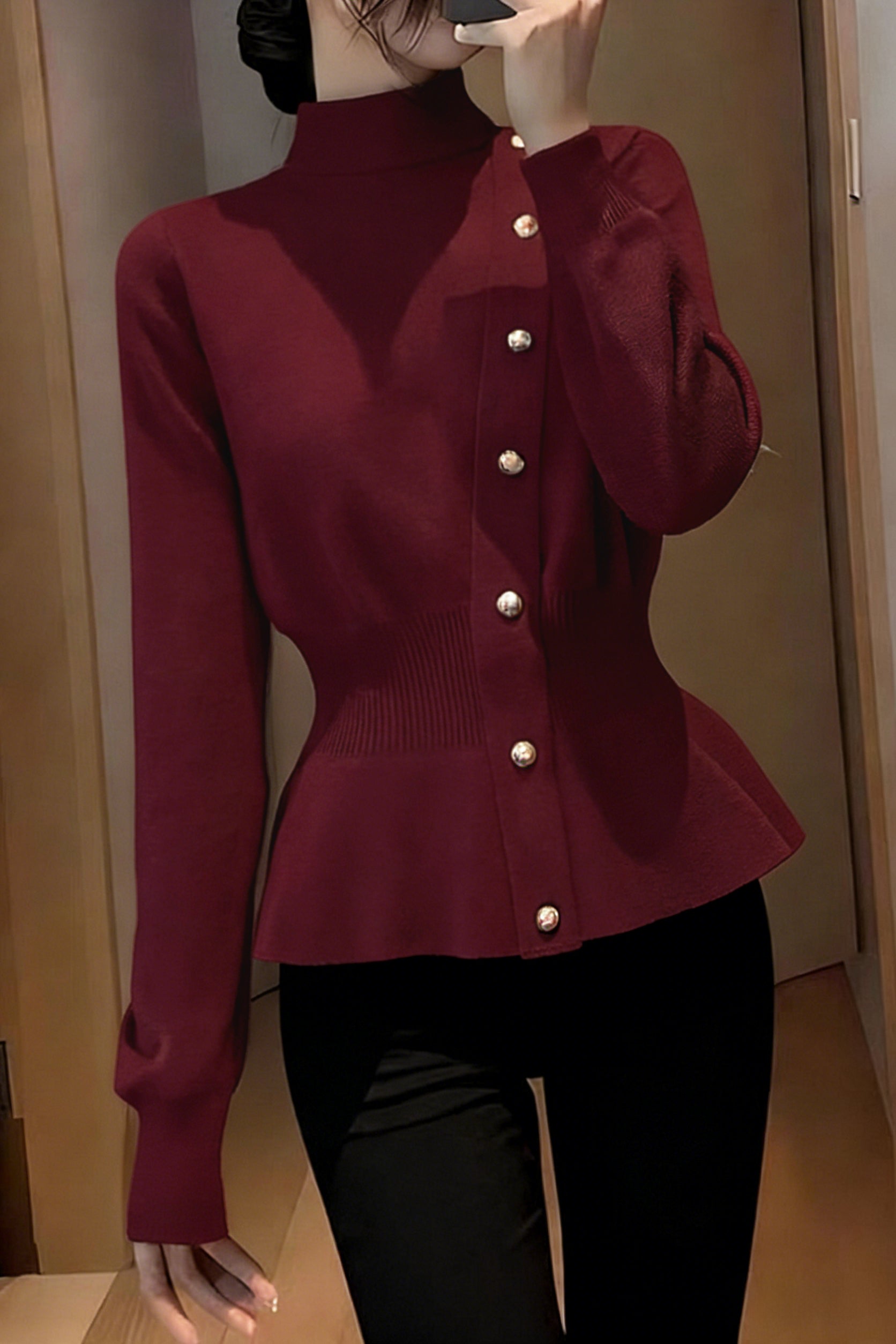 Pullover knitted top, half-high neck long-sleeve waist-cinched fit, solid color, front with decorative buttons, hem with wave edge design |