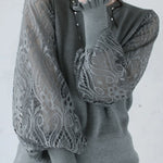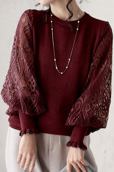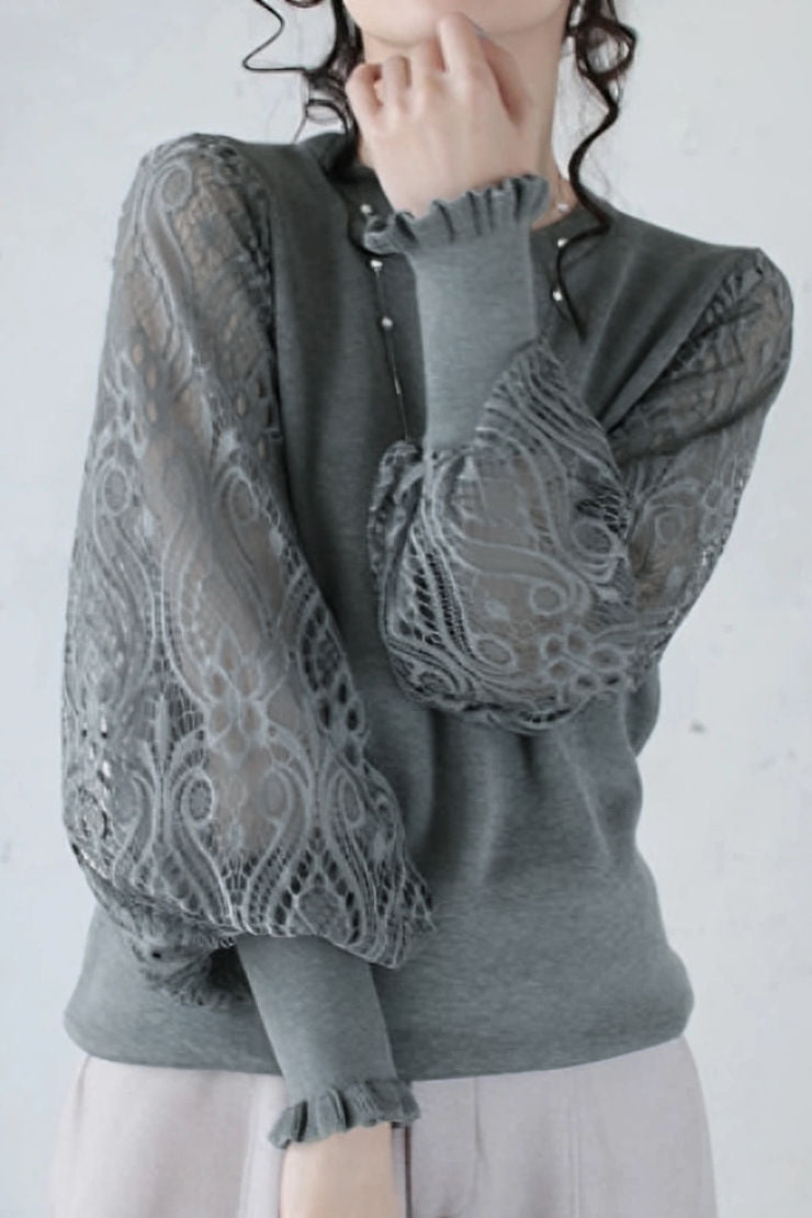 Knitted top, crew neck long-sleeve loose fit, full-body solid-color knitted fabric, sleeves with double-layer design of lace patterns and fine mesh for a sheer finish |