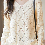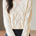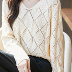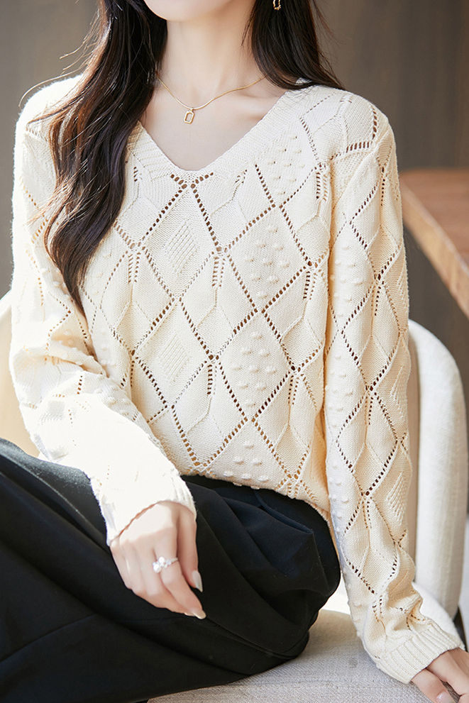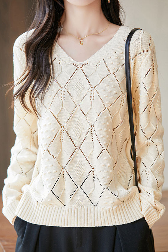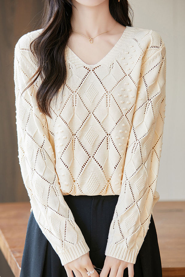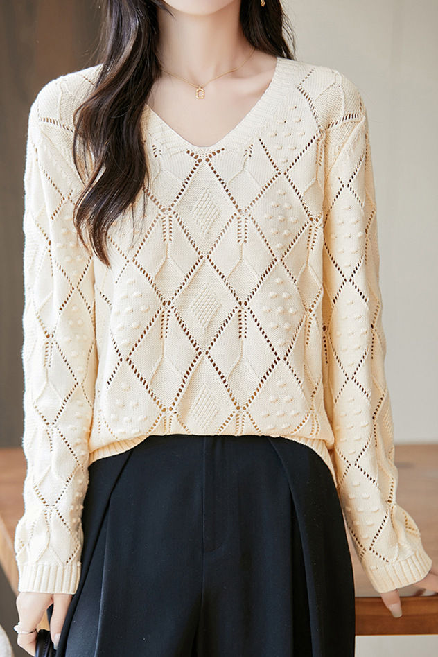 Knitted top, V-neck long-sleeve loose fit, full-body with diamond hollow-out and three-dimensional small dot jacquard decorative texture, cuffs finished with ribbed trim |