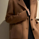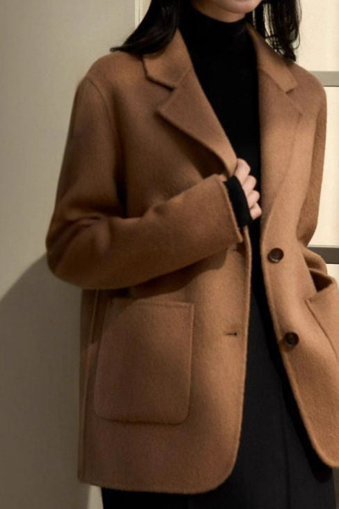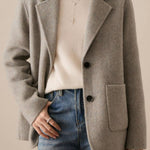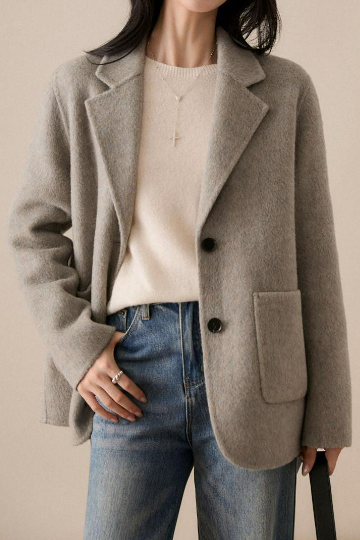 Suit Jacket, notched lapel long-sleeve loose fit, made of wool blend fabric, front placket with openable single-row buttons, two side patch pockets, overall loose and drapable silhouette with natural texture |