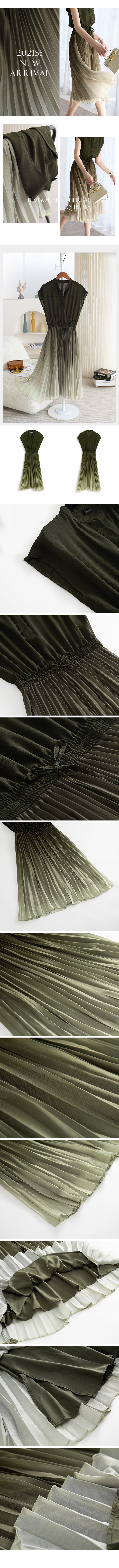 Elastic at the waist (stretchable), keyhole neck, French sleeves, front buttons, pleats, ombre design, knee length, drawstring at the waist (adjustable), lined (only lower half), mixed materials |
