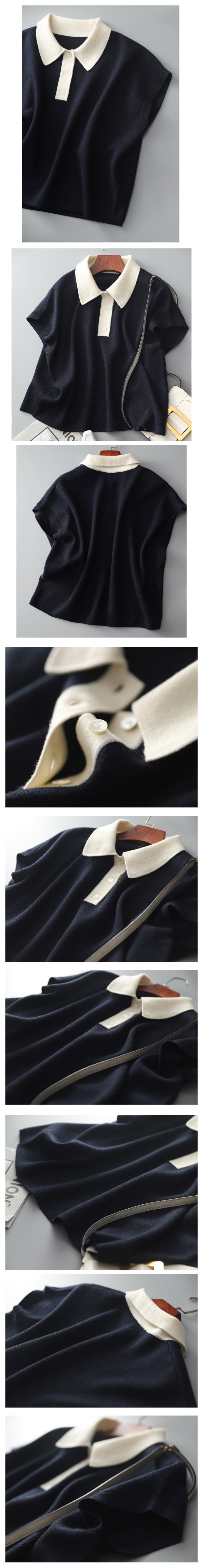 Polo collar, bi-color switch design, French sleeves, front opening button, knit material, slight stretch |