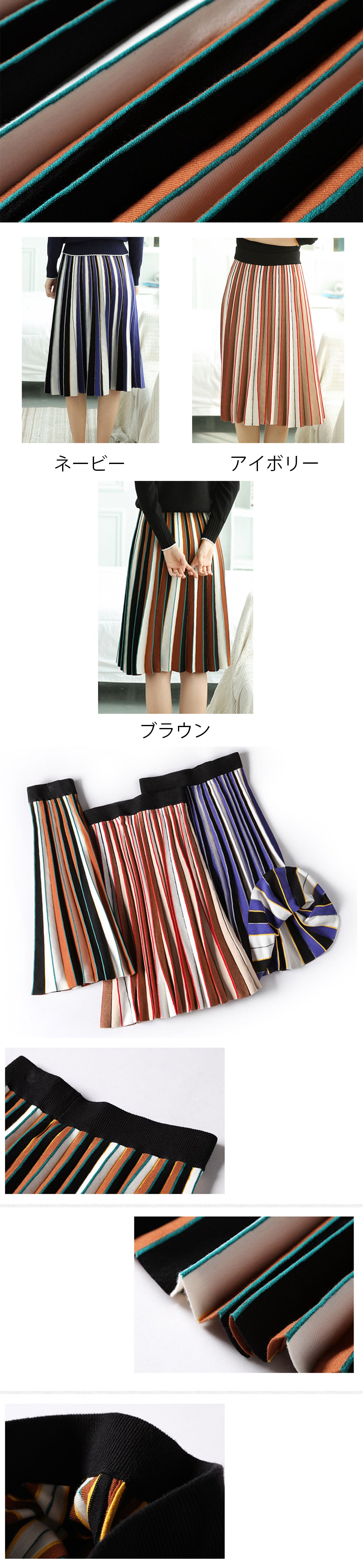 Striped design, A-line, with rubber at the waist (stretchable), long length, flared hem, color-matching design, knitted material, high waist |