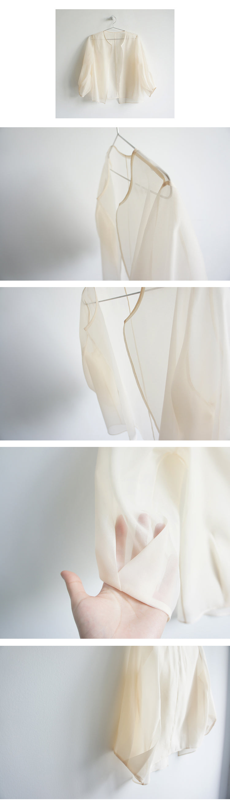 No collar, front opening design, no buttons, sheer, organza material, piping design, long sleeves, solid color |