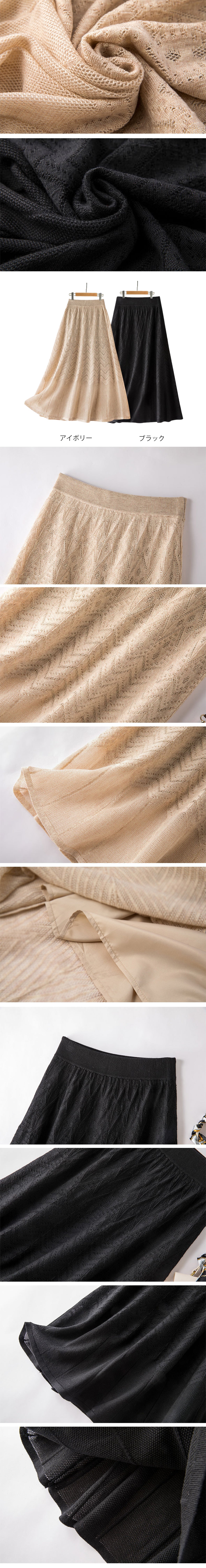 Elastic at waist (stretchable), openwork knit, knit material, A-line, long length, flare silhouette, flared hem |