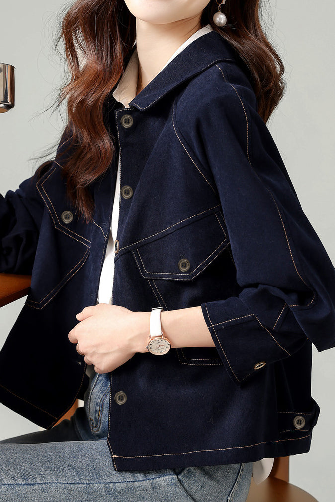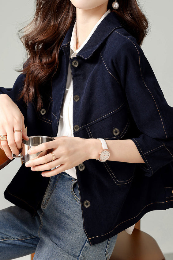 What I like most is the clean fit. It’s slightly cropped, so it looks flattering even with high-rise bottoms. The dark navy color makes it feel more dressed up than your typical denim jacket. I've already worn it three times this week.