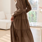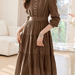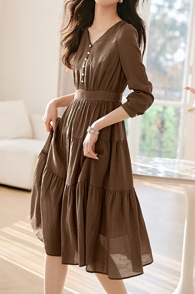 Dress, V-Neck Long Sleeves, Solid Color with Texture, Decorative Buttons at Front Center, Invisible Zipper Closure on Right Waist, Cuff Button Closure |