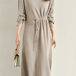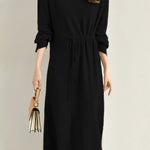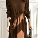 Dress, Crew Neck Long Sleeves, Waist Cinching Design on Right Side, Adjustable Drawstring, Irregular Cuff Design |