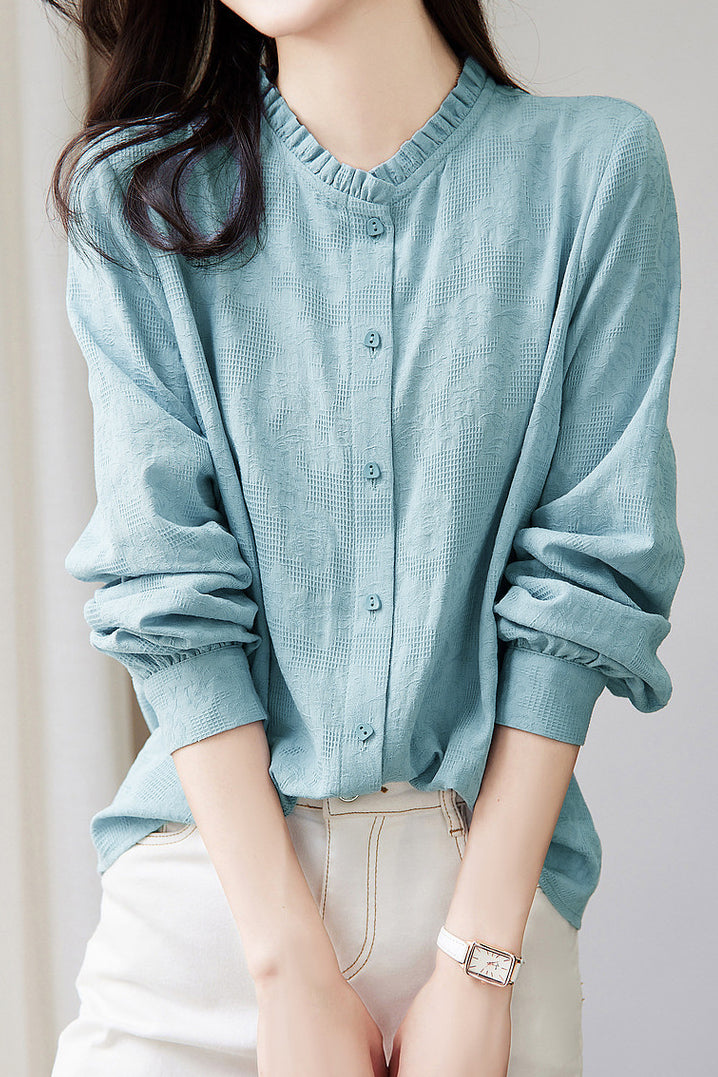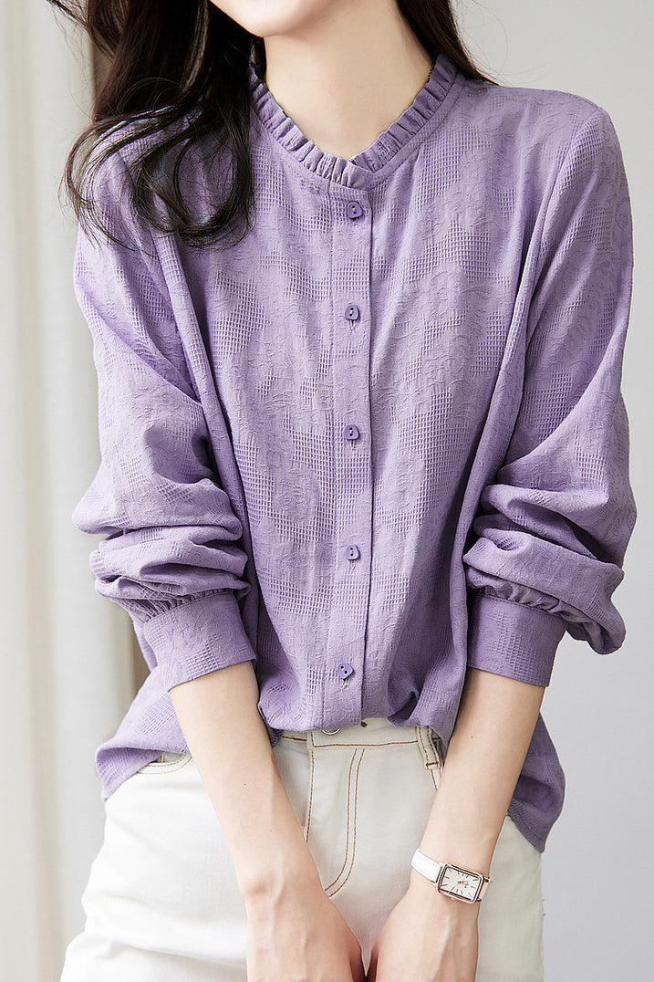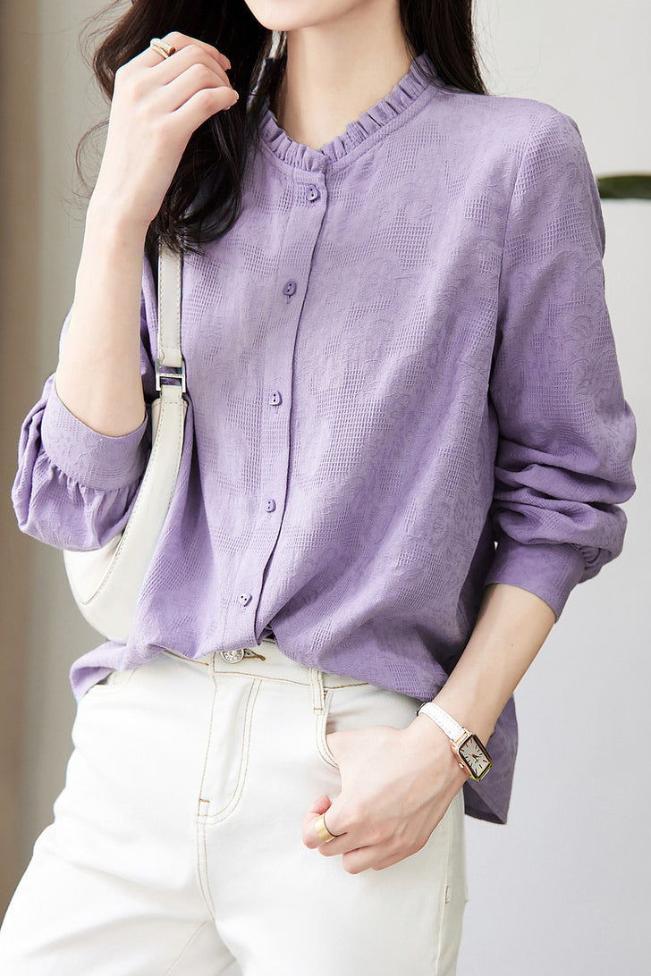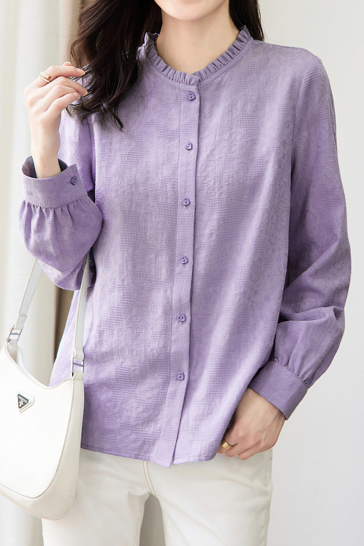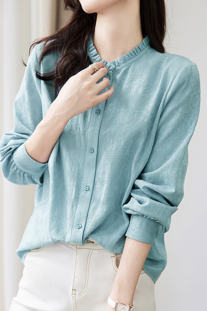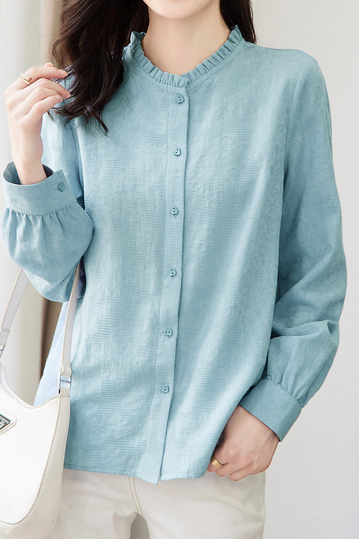 Shirt: Stand collar long sleeves, lace stand collar design, front button closure, button cuffs, textured solid fabric. |