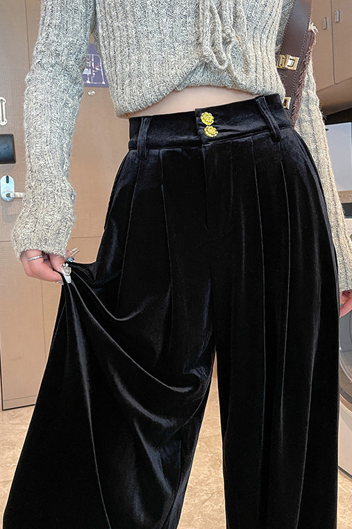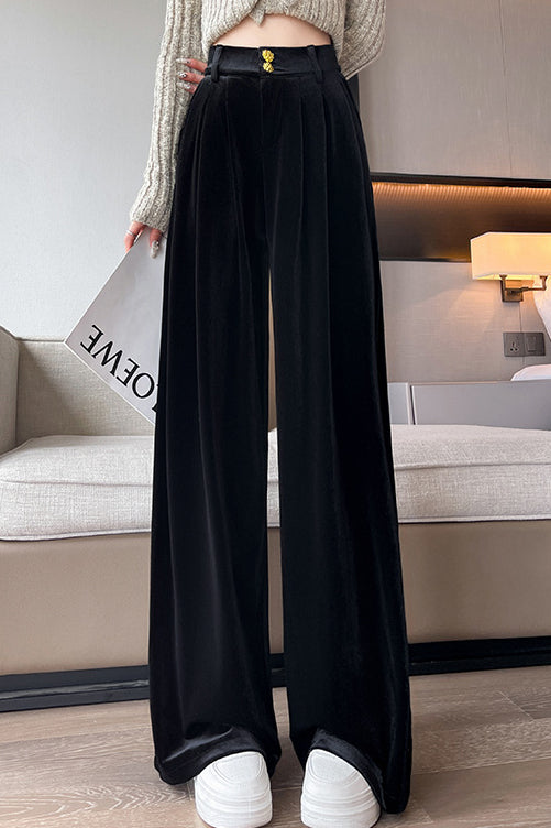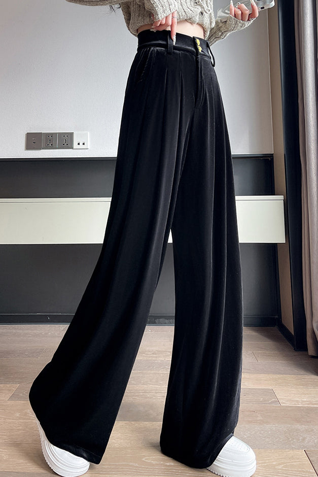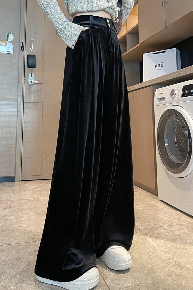Wide-Leg Trousers in velvet fabric that drapes naturally, warm and comfortable, with a metal button, zipper closure, pleated front design, and side pockets |