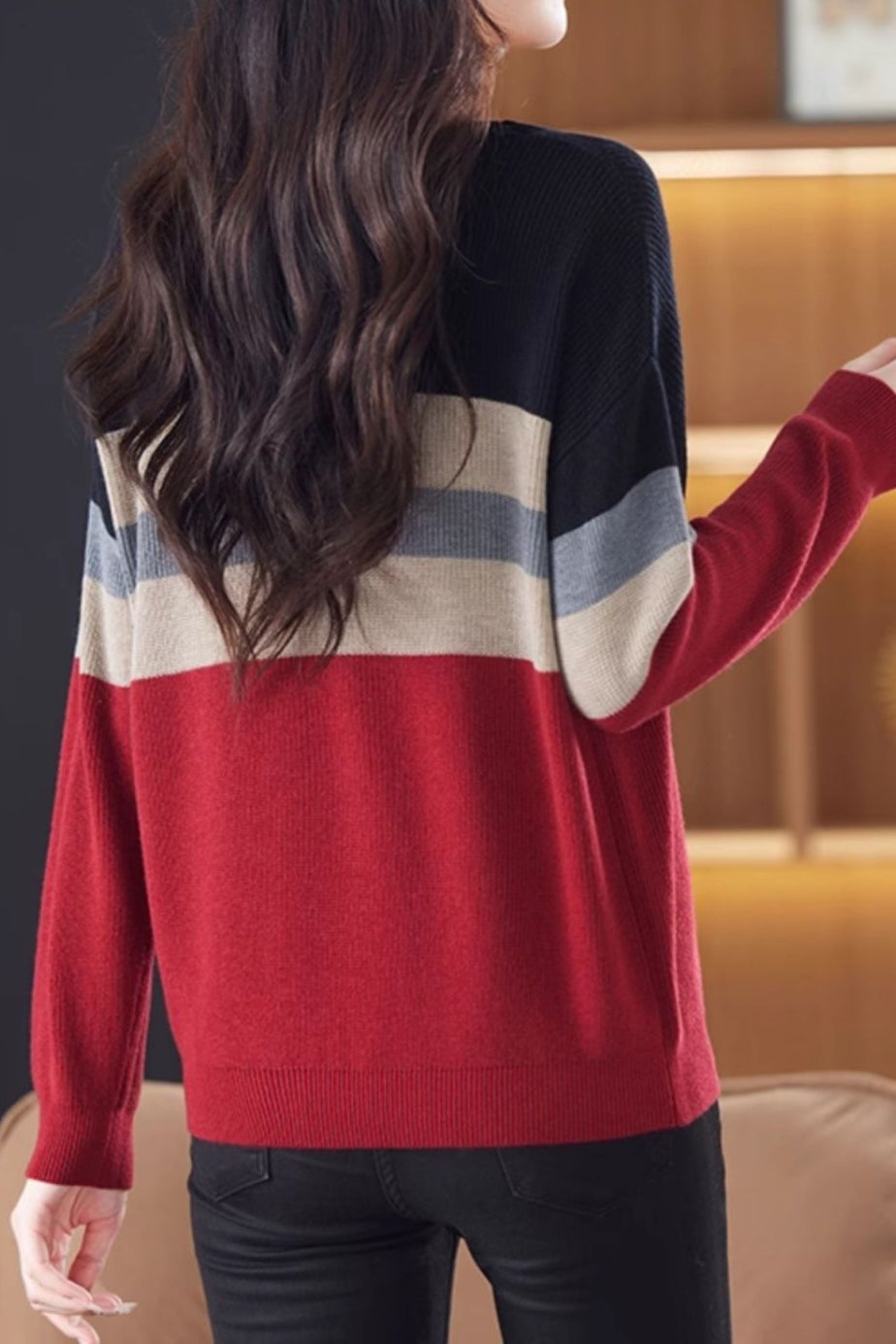 Sweater with color-block striped design, round neck, long sleeves, and loose fit |