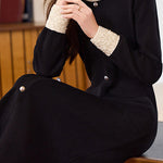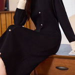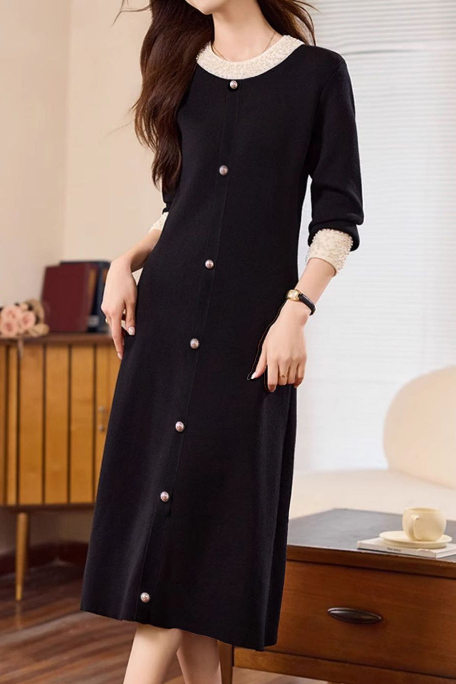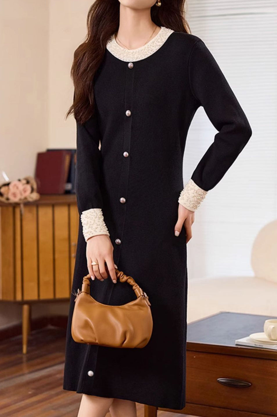 Dress with color-block neckline and cuffs with bead decoration, fitted waist, A-line silhouette, faux button placket at the front, and metal decorative buttons |