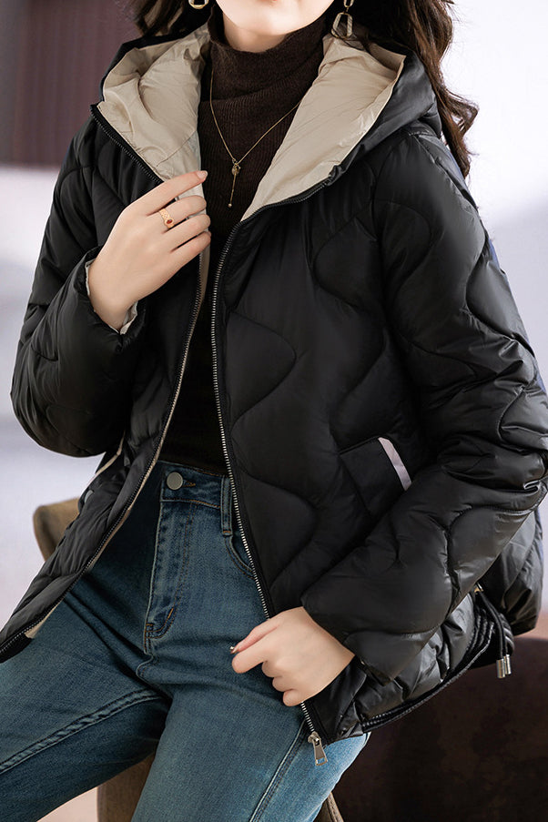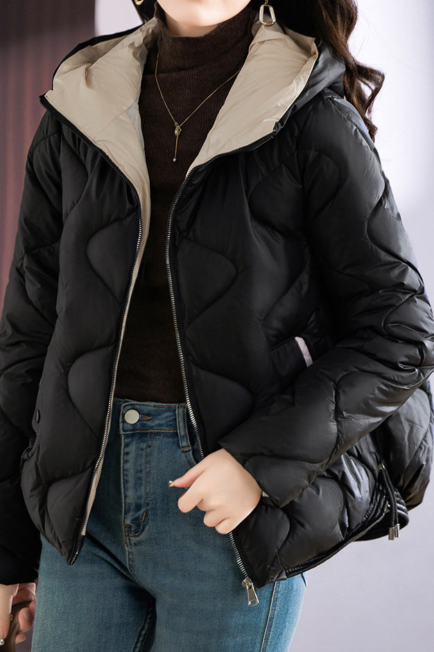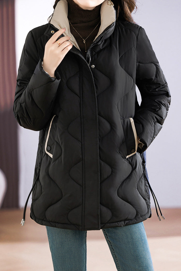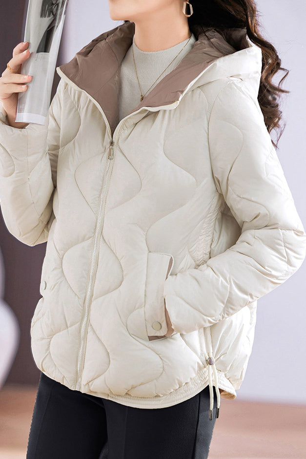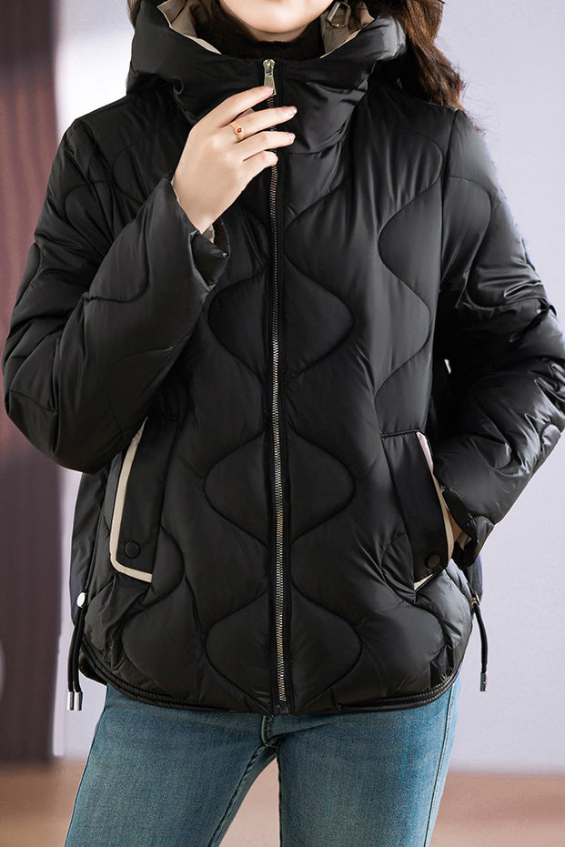 Short Cotton Jacket with a hood and long sleeves, front zipper closure, adjustable drawstring on both sides; Long Cotton Jacket with stand collar, long sleeves, front zipper closure, and adjustable drawstrings on both sides |