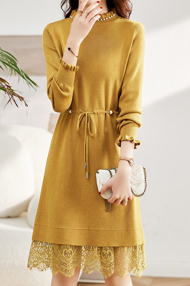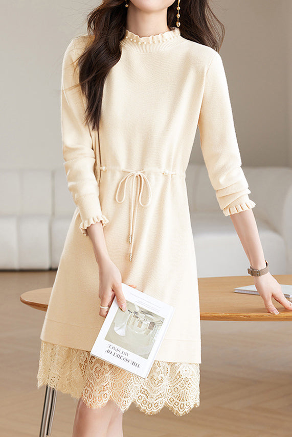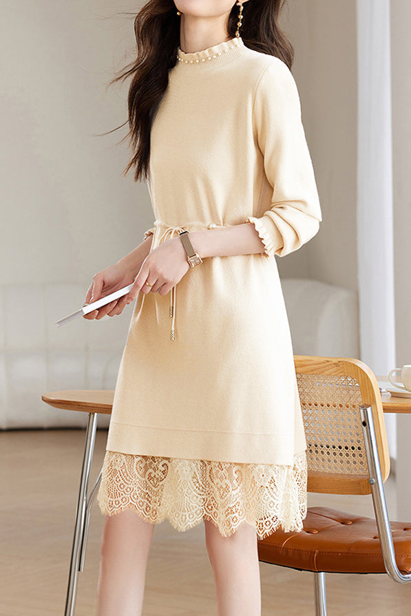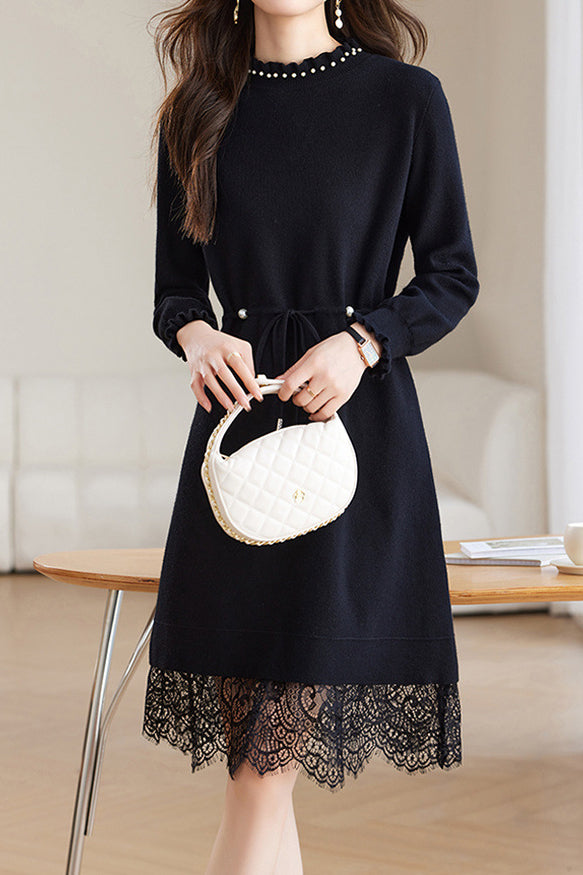 Dress with stand collar and long sleeves, adjustable pearl belt at the waist, pearl embellishment at the neckline, and lace trim at the hem |