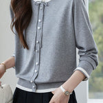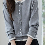 Knitted cardigan,color-block crew neck,decorative bow tie at front collar,front button-front unbuttonable,long sleeves loose fit,color-block cuffs and hem |