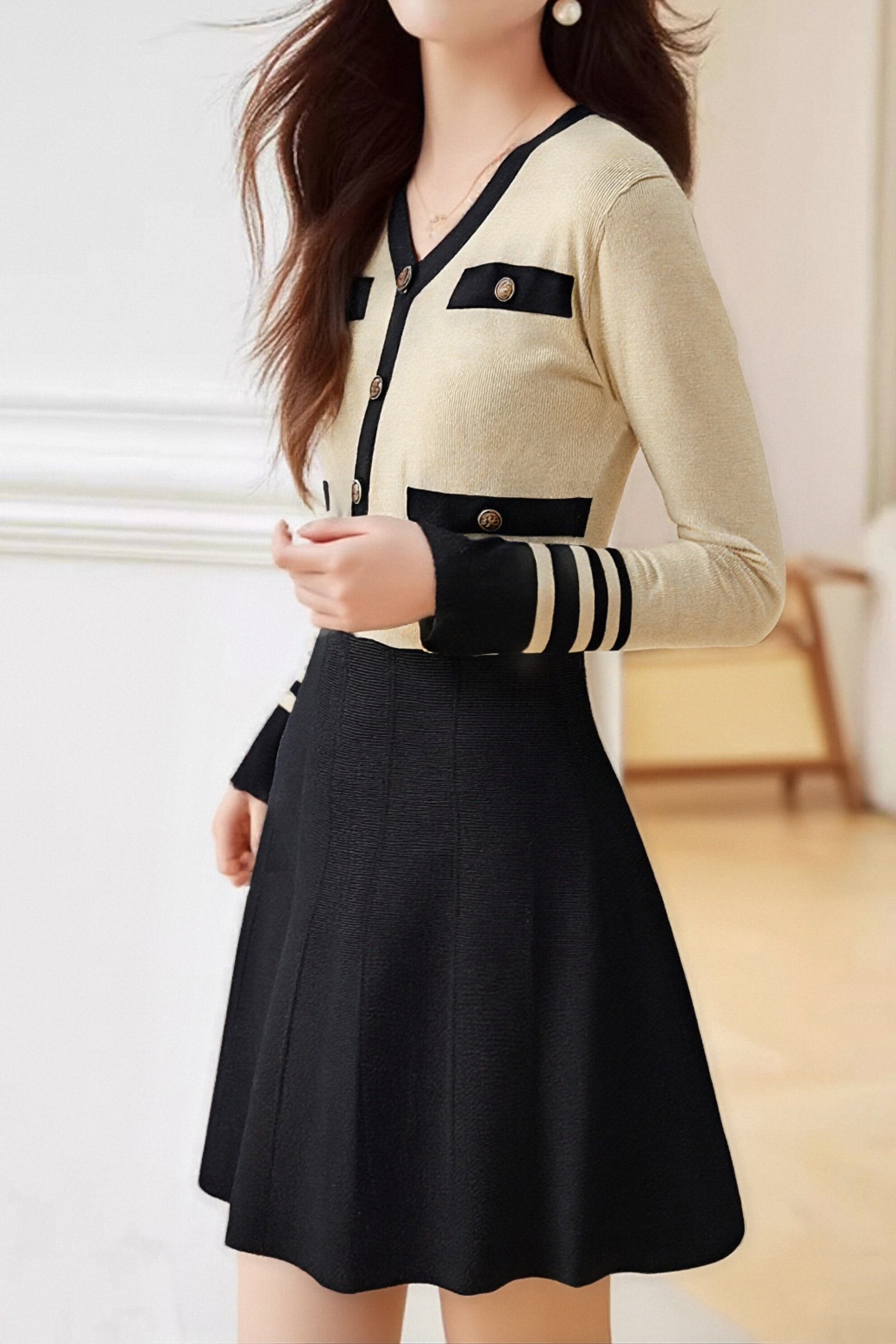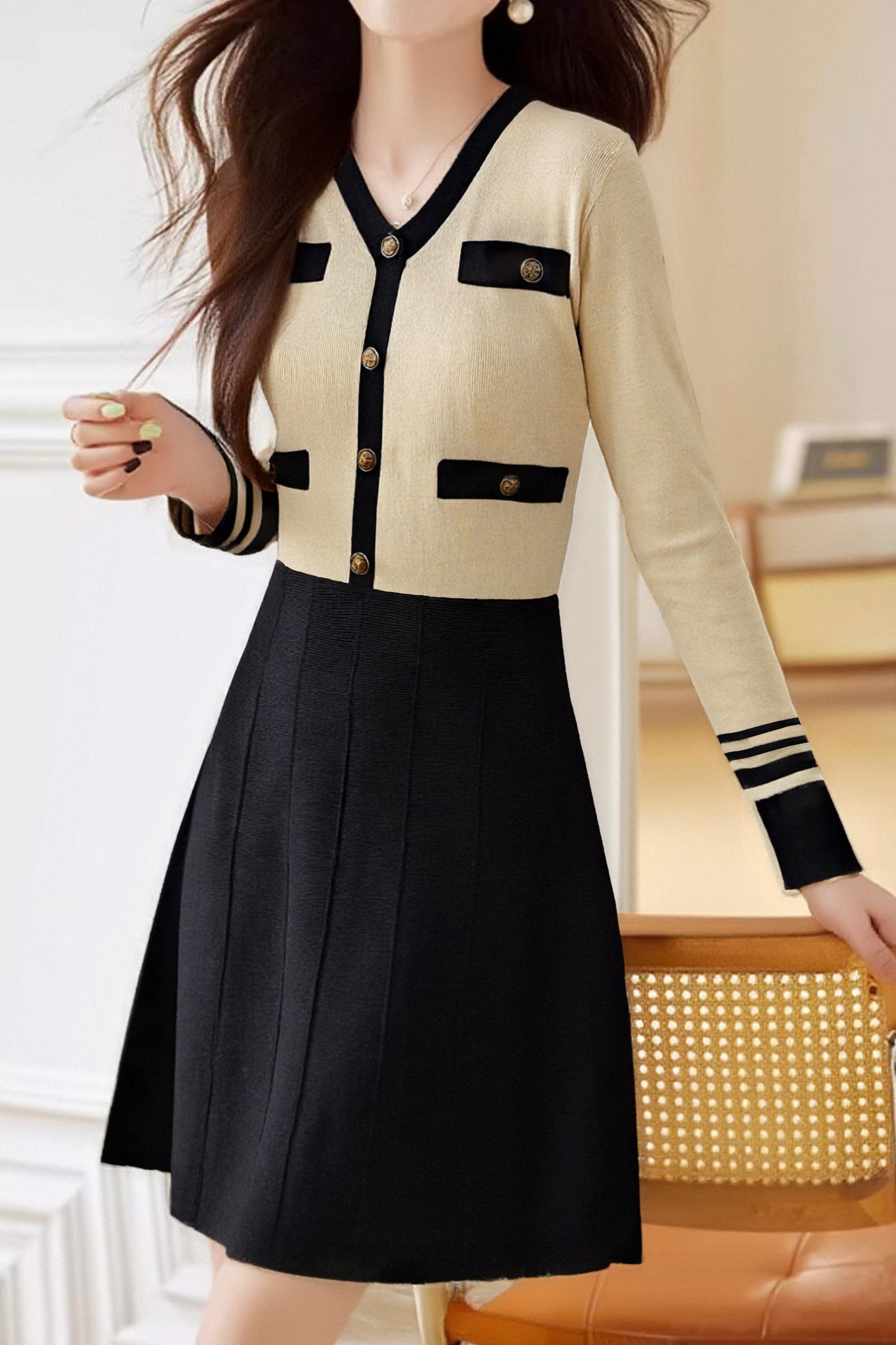 Knitted dress,v-neck,front center with decorative buttons,upper section with color-block trim design,waist-cinched a-line fit |