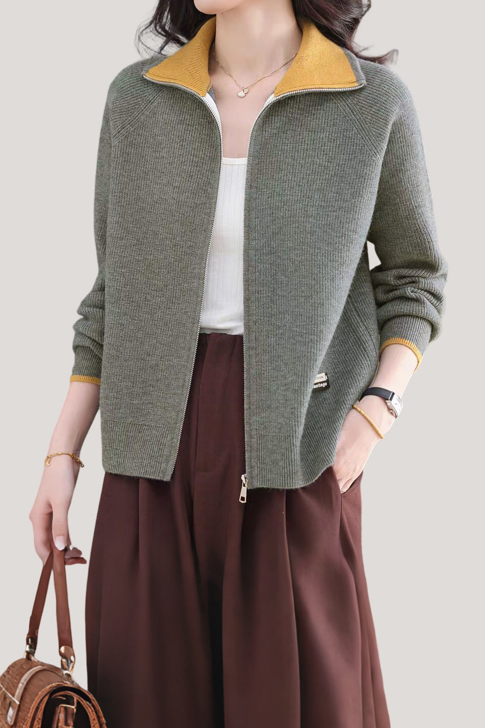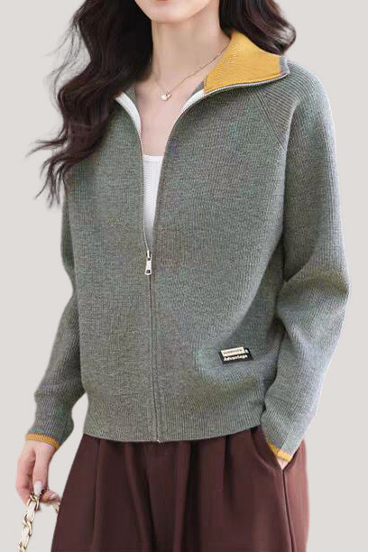Knitted cardigan,lapel loose fit,color-block design on lapel and body,zipper closure at front center |