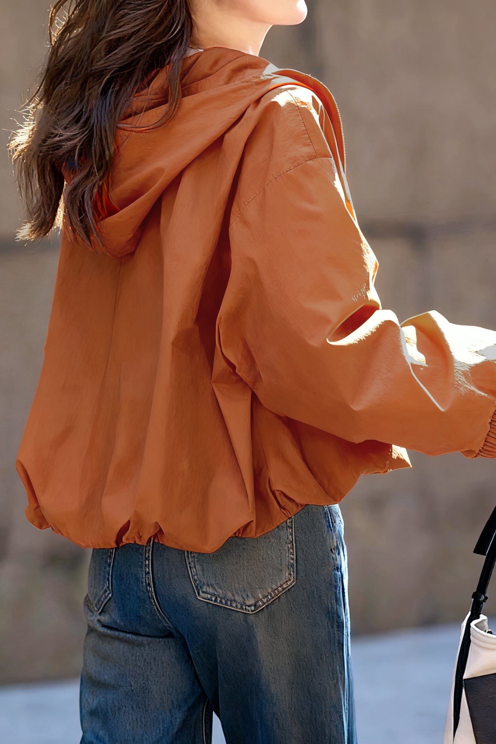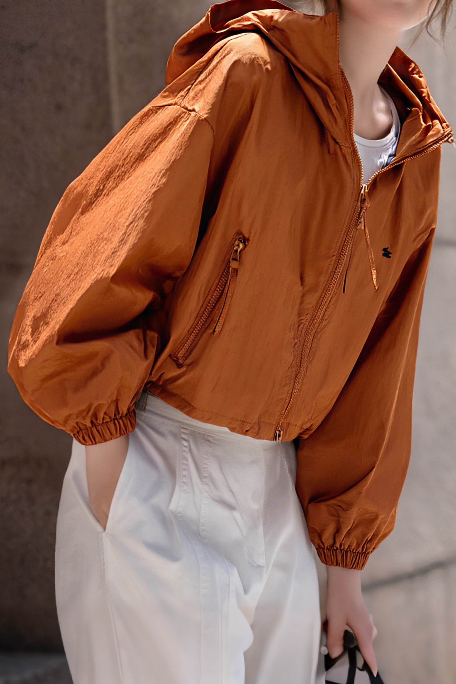 Short jacket, hooded design, front center with double-headed zipper for opening, side pockets at front waist, zippered pocket openings, elastic adjustable drawstring at hem, small embroidery on front chest, solid color, long-sleeve loose fit |