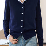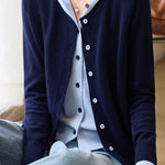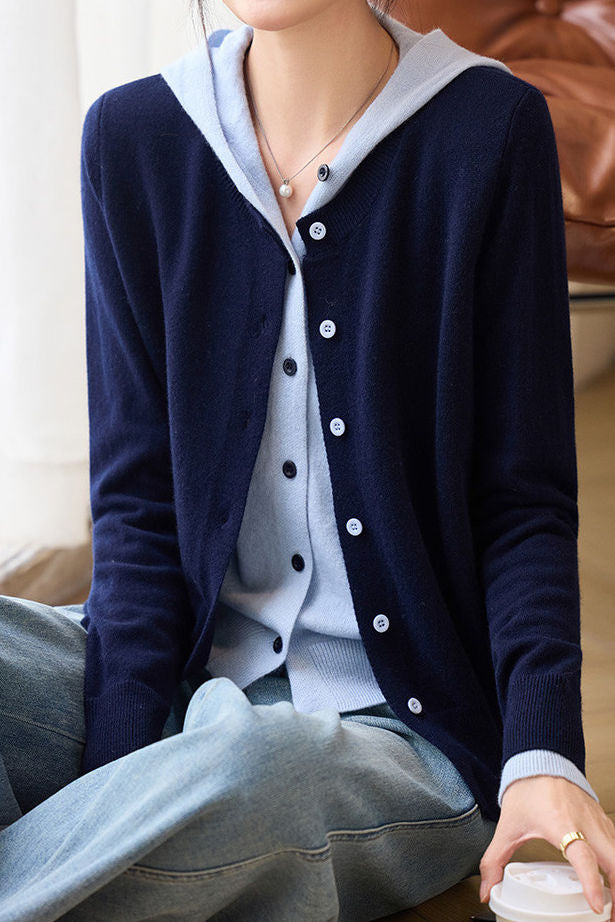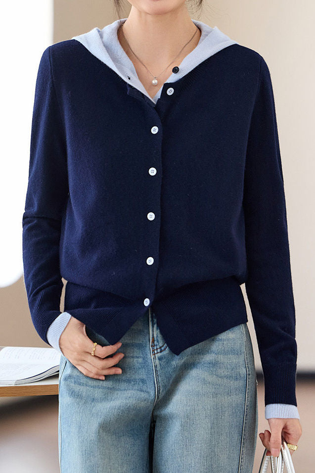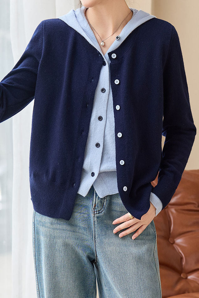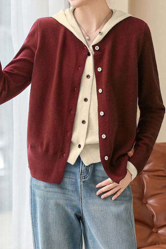 Casual Minimalist Color-Block Hooded Fake Two-Piece Knitted Cardigan