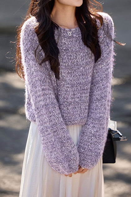 Casual Versatile Sequin Crew Neck Pullover Sweater