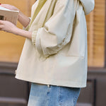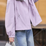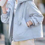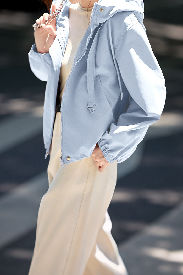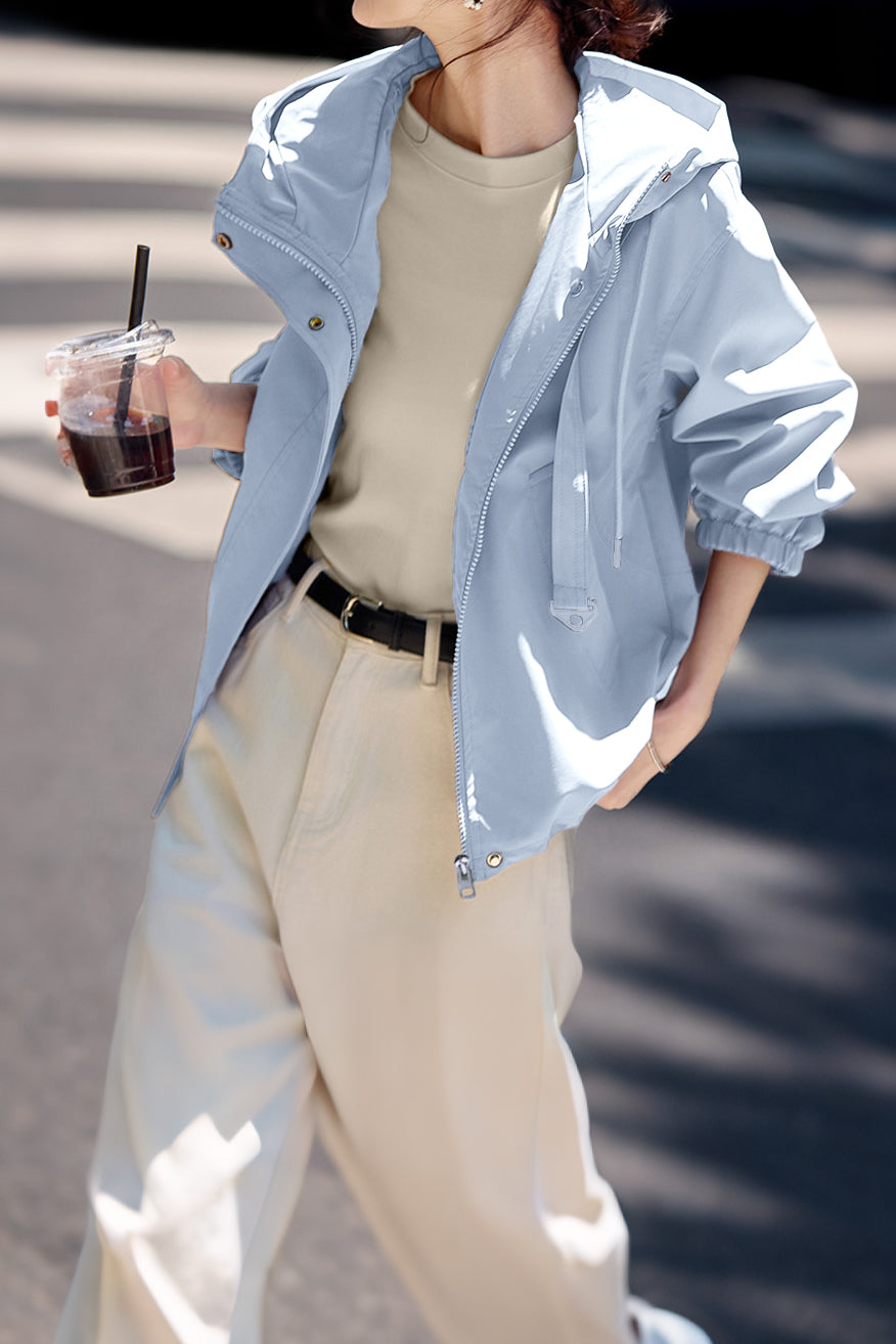 Hooded jacket,front with structural dividing lines and side pockets,front center double-layer zipper,hood with double drawstring design,cuffs with elastic band |