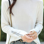 Pullover sweater,half-high neck long-sleeve loose fit,neckline and cuffs with decorative rhinestone design |