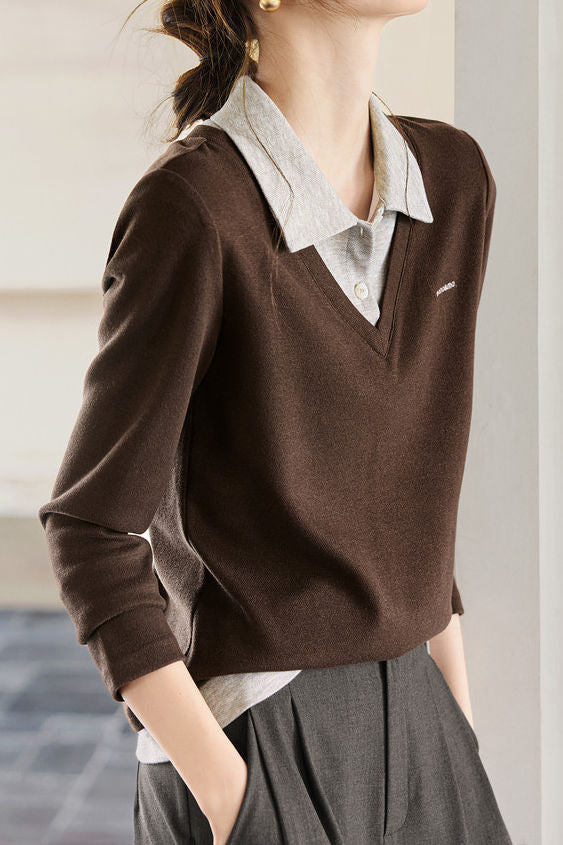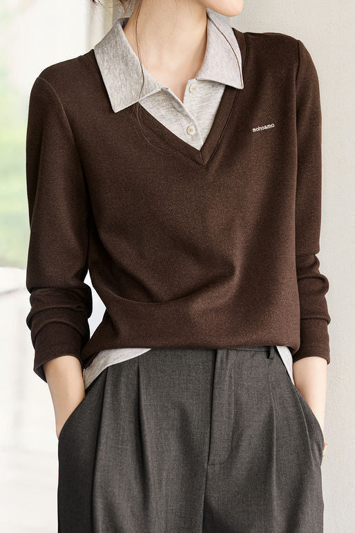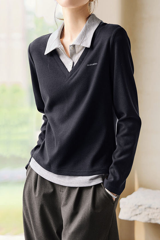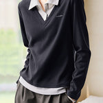 Fake two-piece shirt,shirt collar pullover long-sleeve loose fit,chest with embroidery decoration,fake two-piece color-block design |
