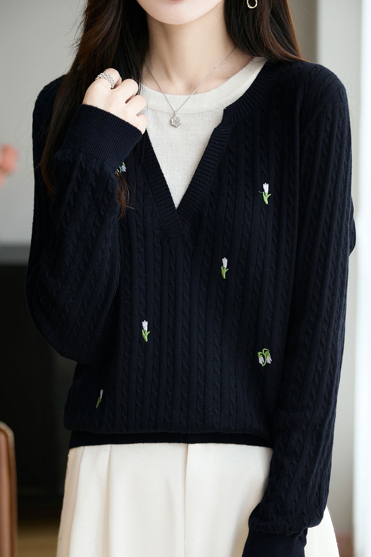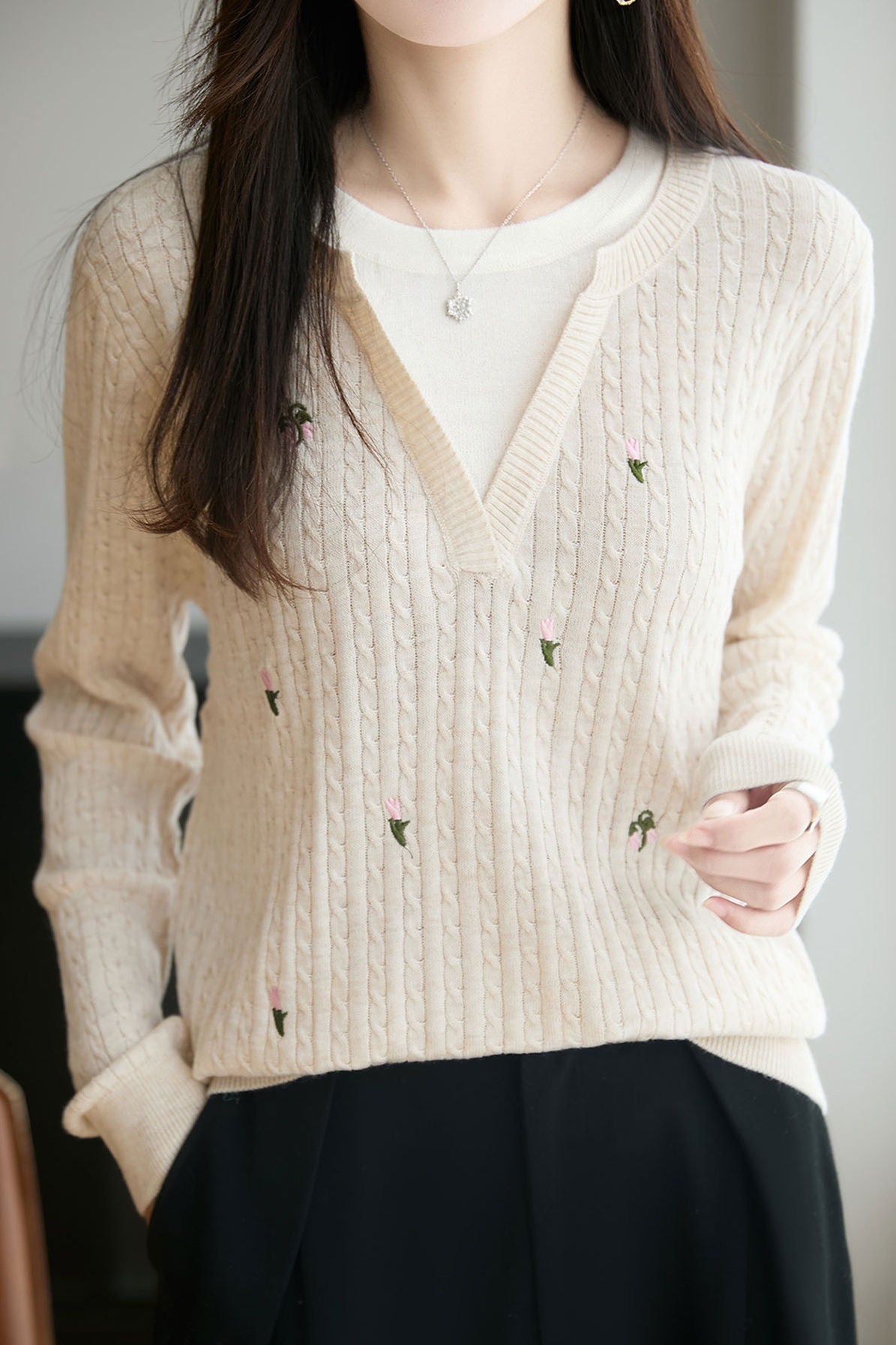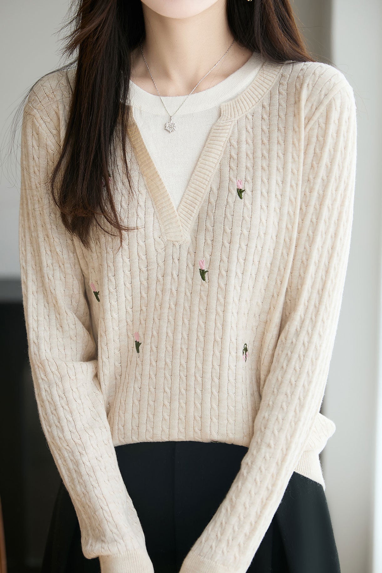 Pullover sweater,crew neck long-sleeve loose fit,white crew neck and paneled v-neck knitted body form color-block fake two-piece style,knitted fabric full-body with vertical rib and jacquard design |
