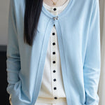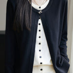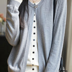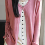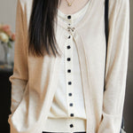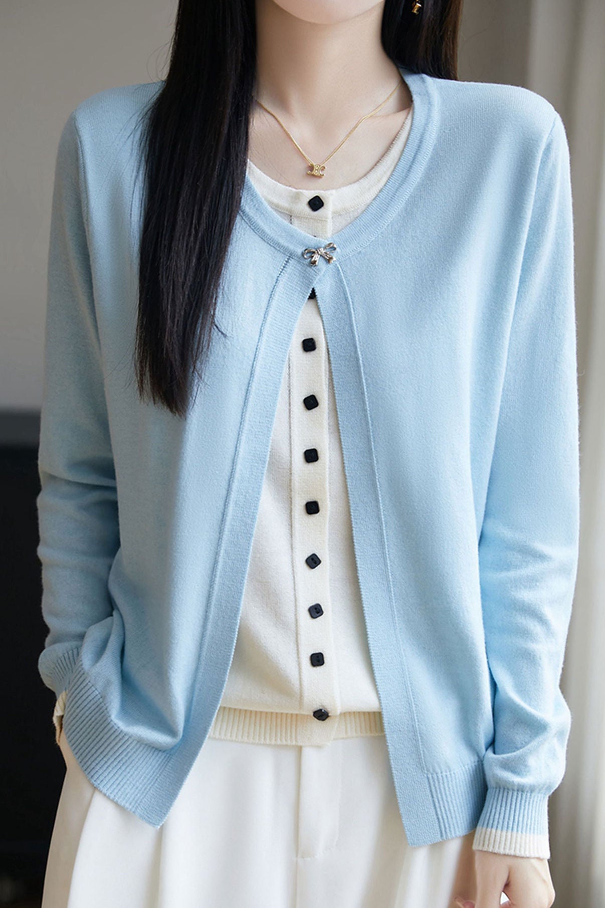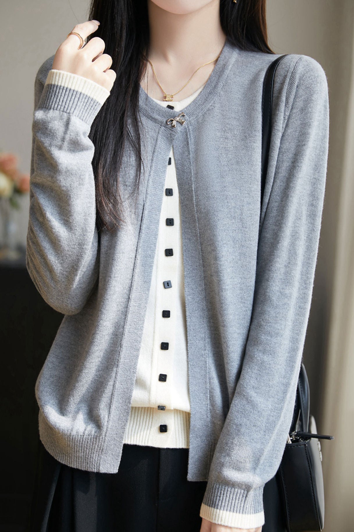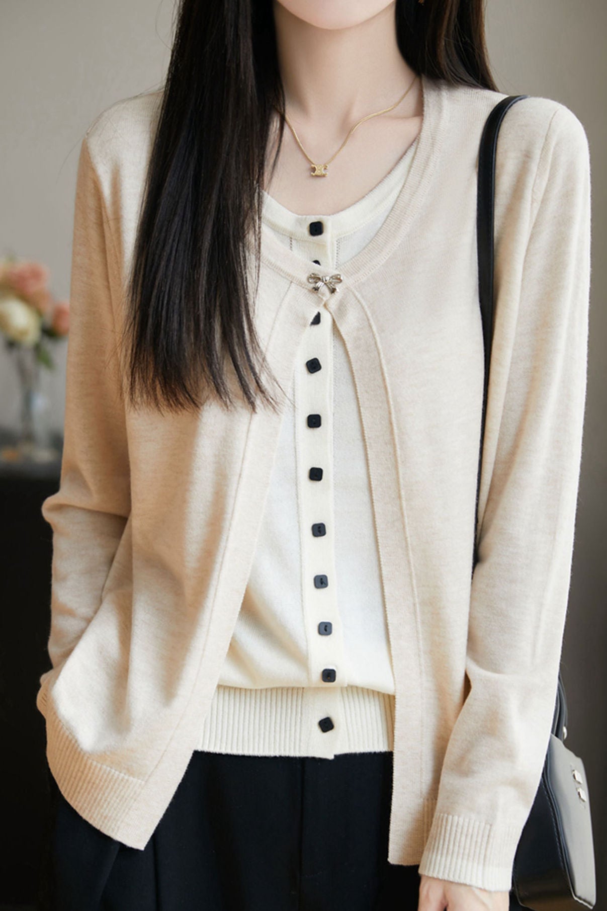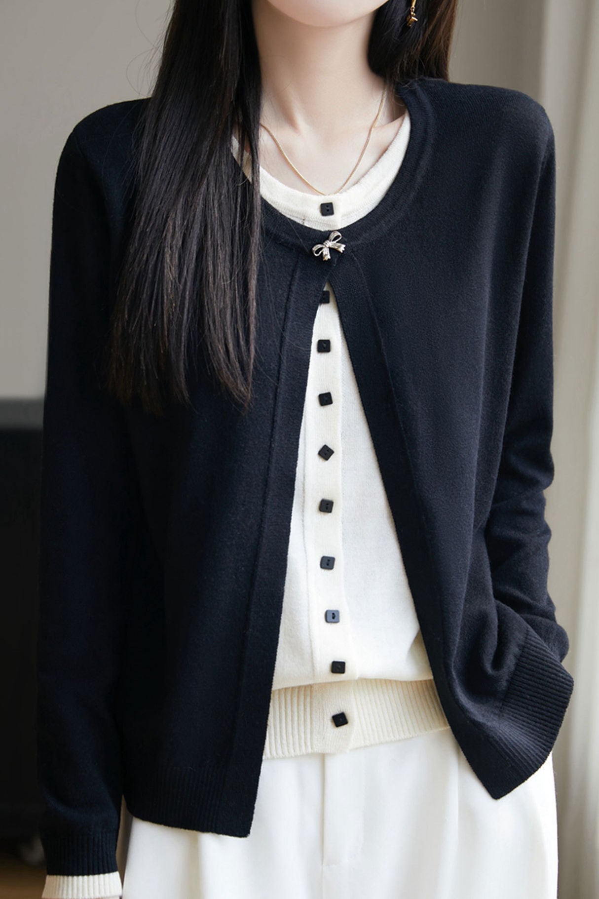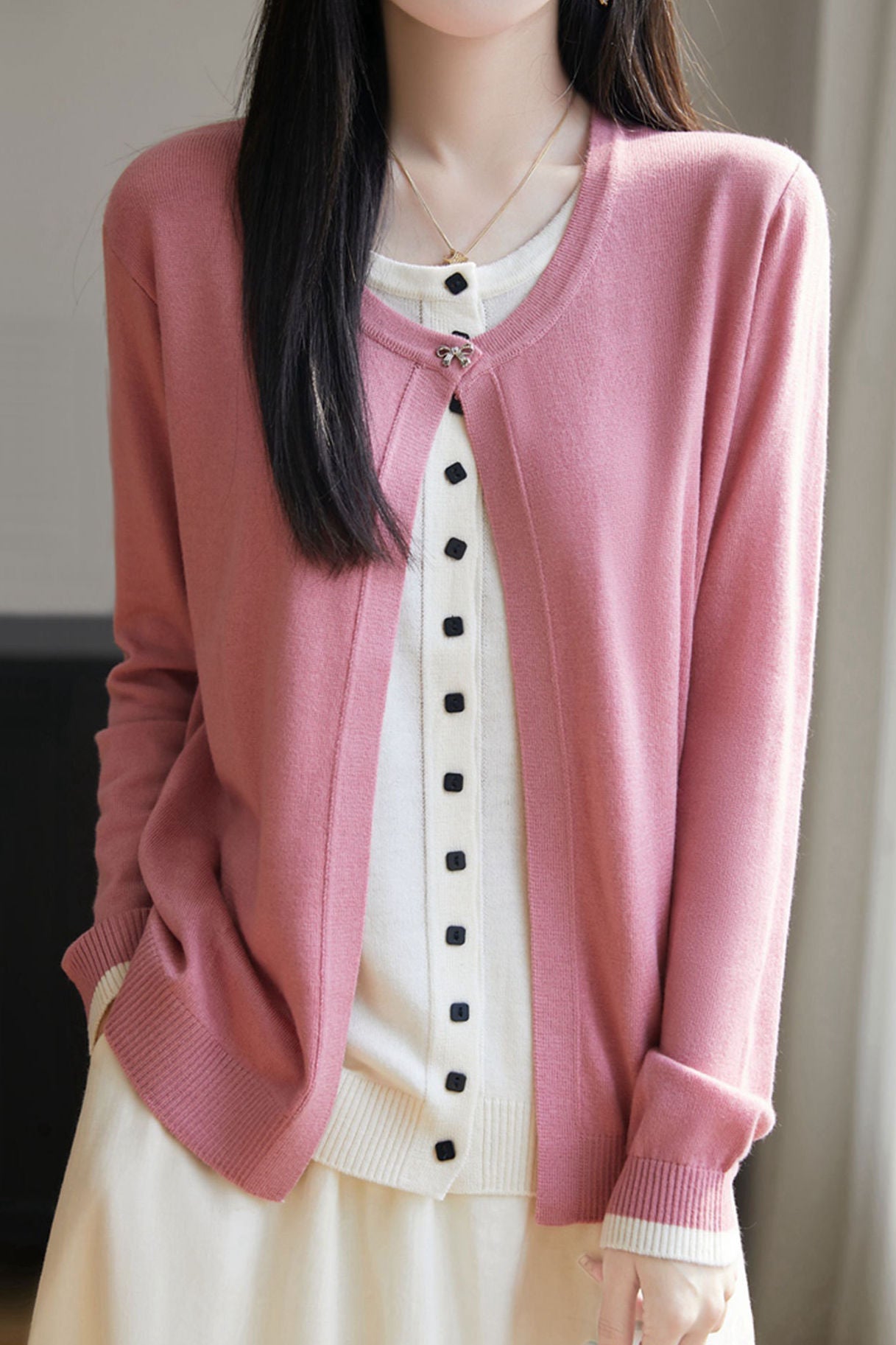 Cardigan,crew neck long-sleeve loose fit,beige inner garment and color-block outer garment form fake two-piece design,inner garment front center with openable square buttons,outer garment neckline with one openable metal bow-knot shaped button,cuffs with color-block design |