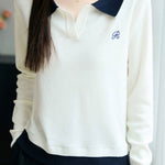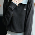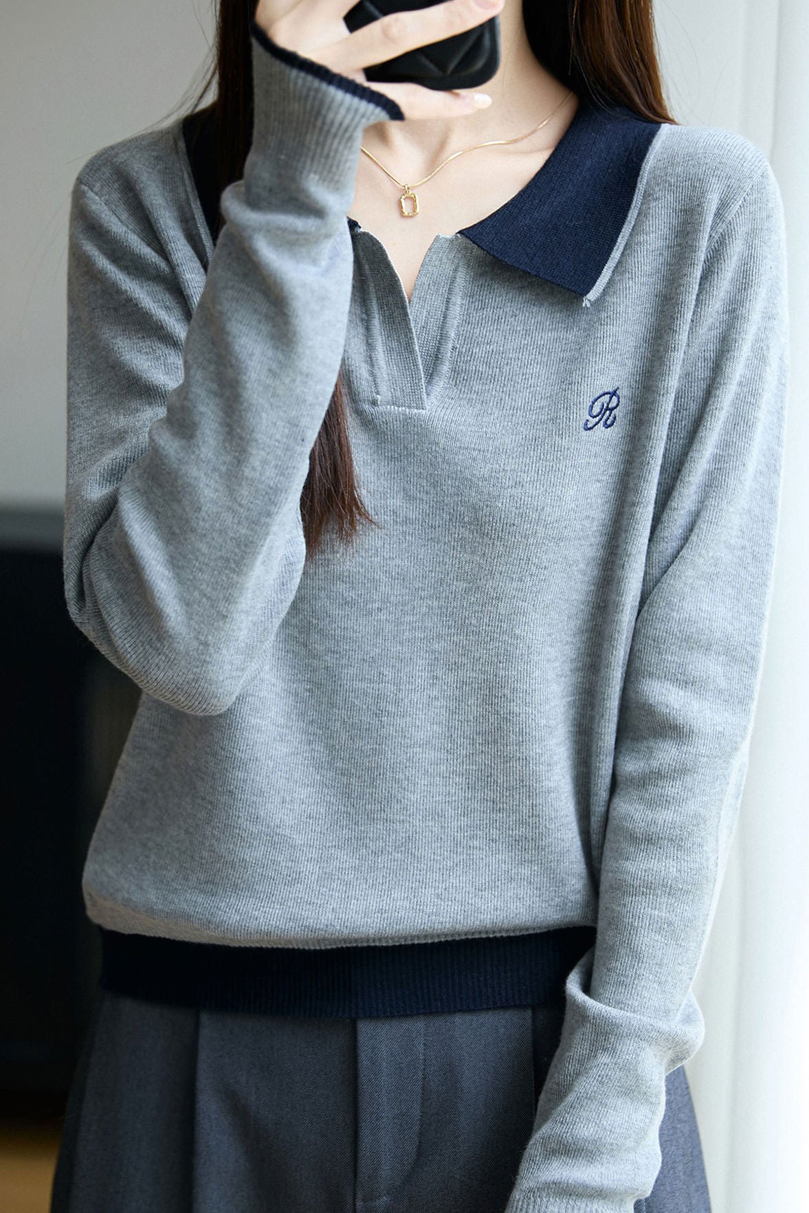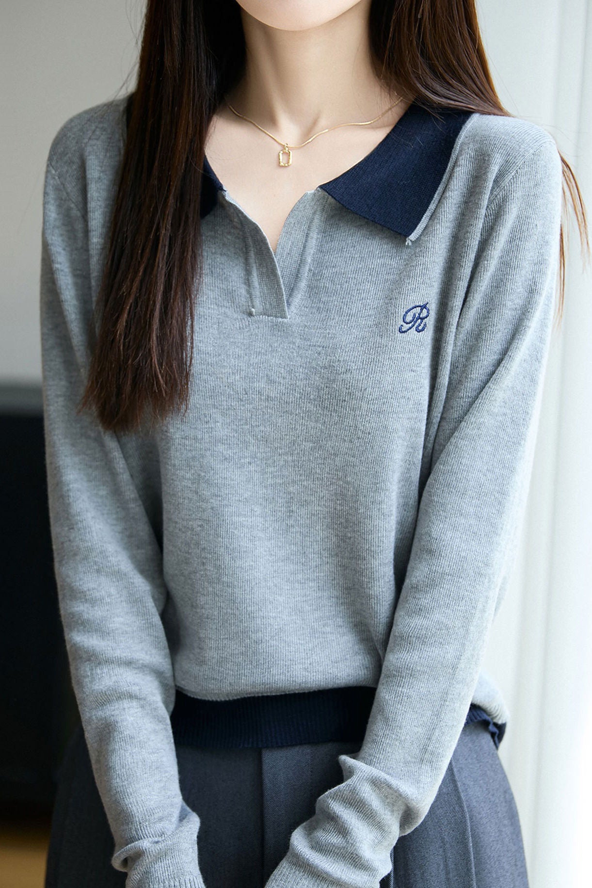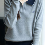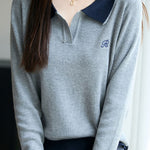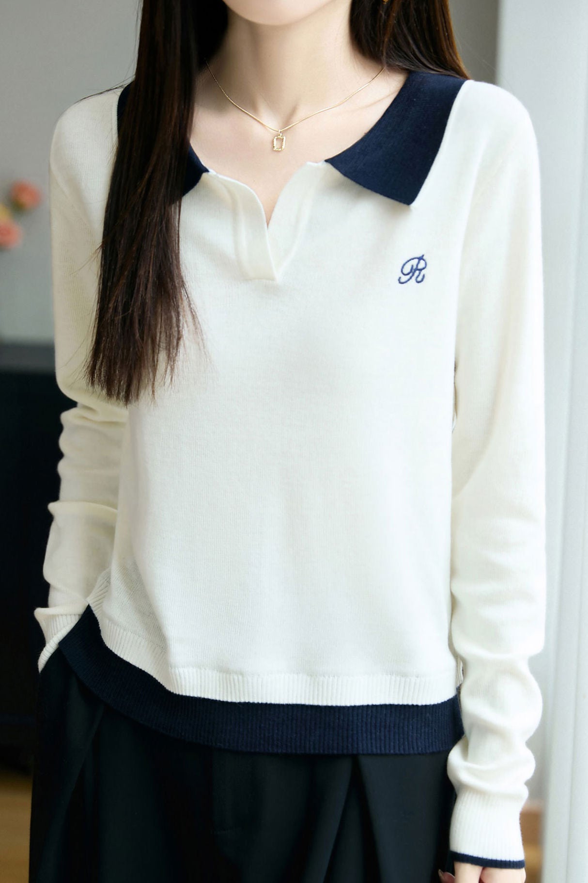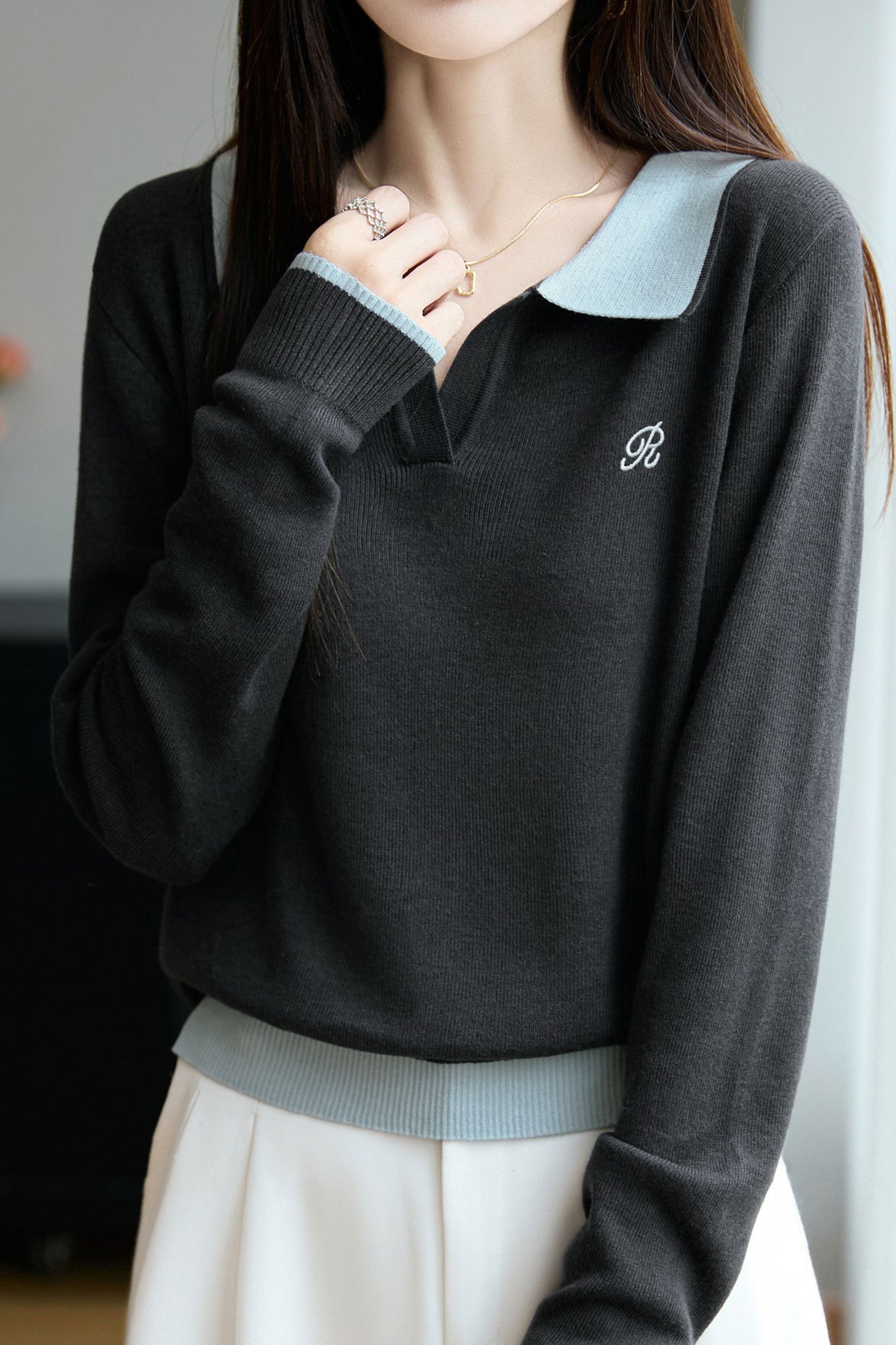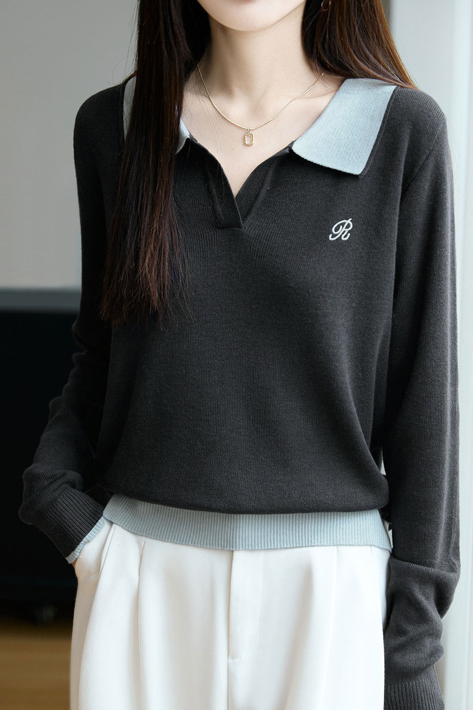 Knitted top,lapel long-sleeve loose fit,buttonless lapel design,collar,hem and cuff binding with color-block design |