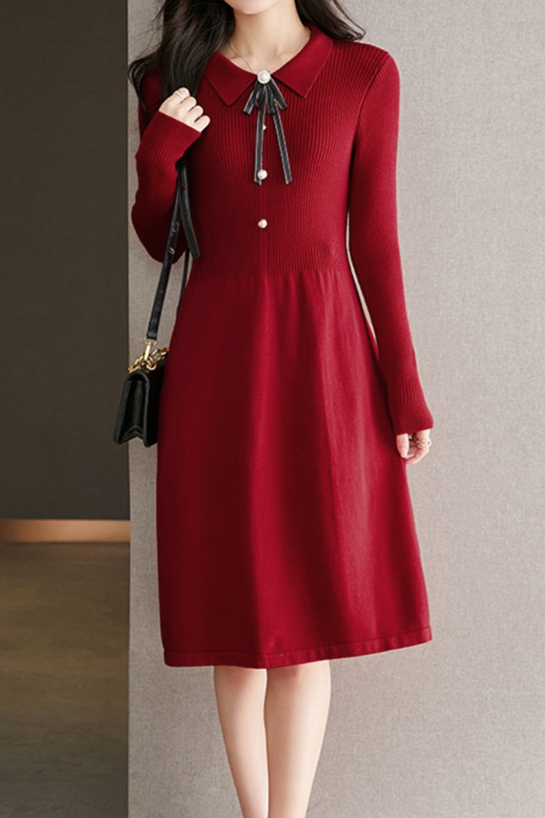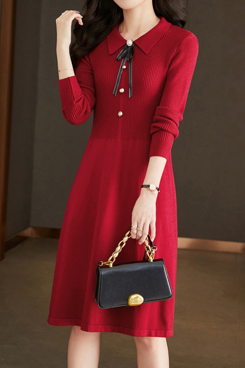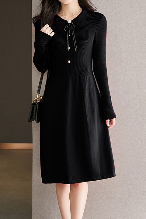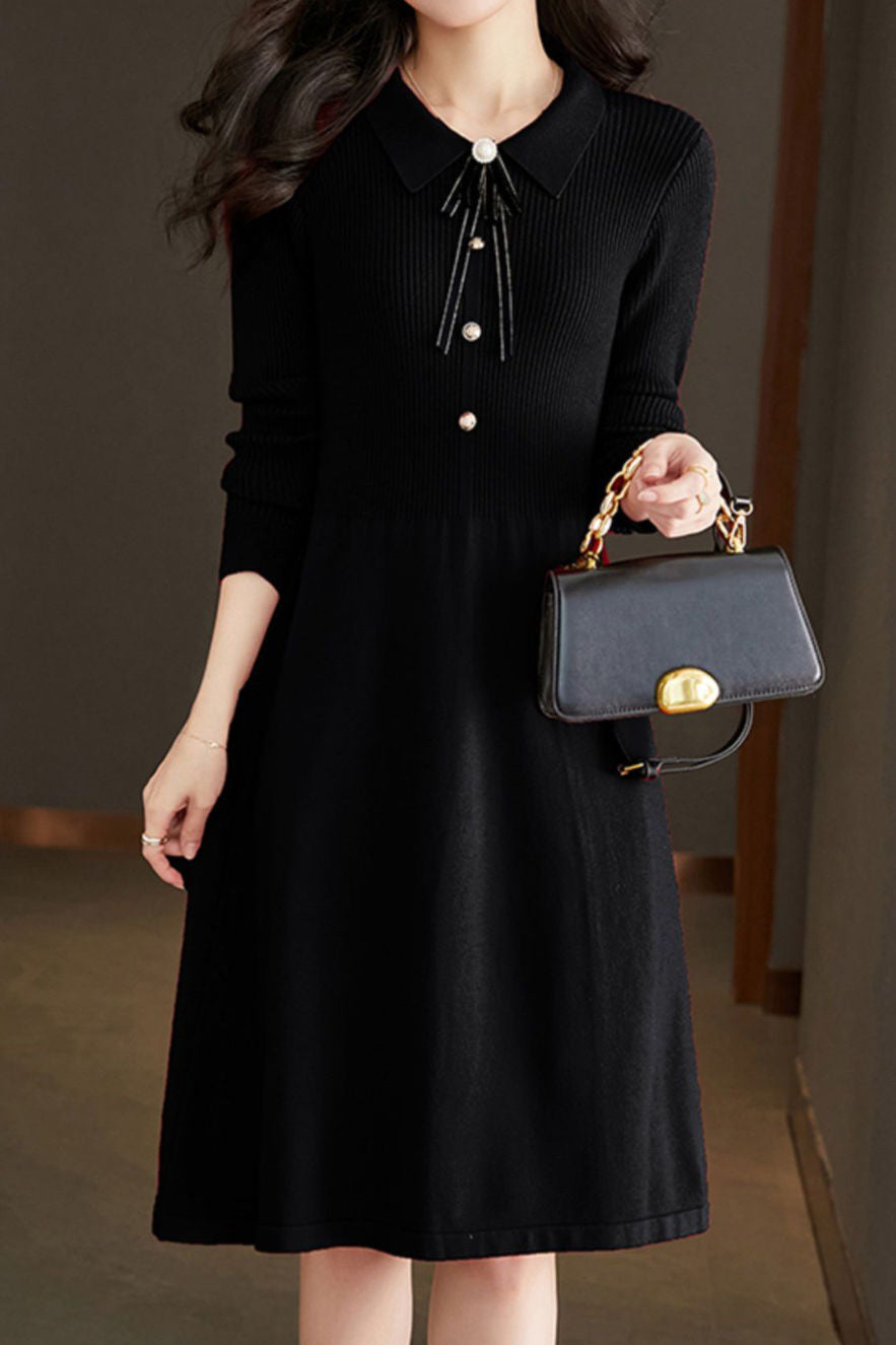 Knitted dress,shirt collar long-sleeve slim fit,front center with decorative buttons and detachable bow-knot brooch |