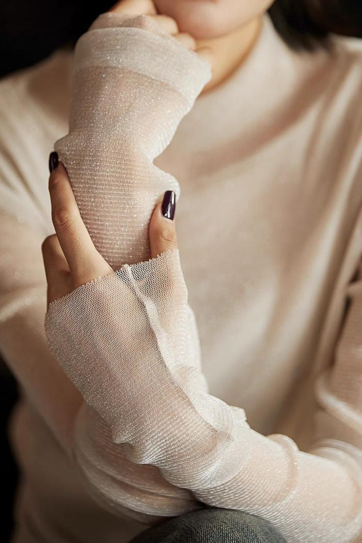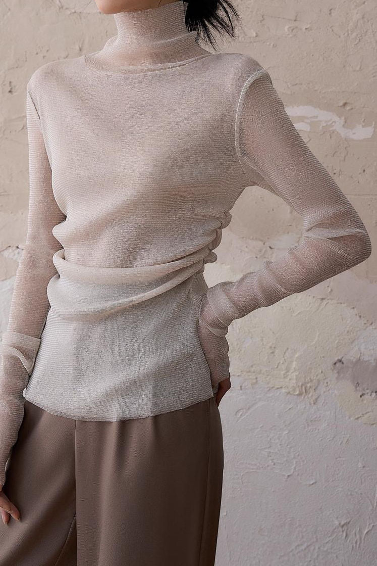 Pullover blouse,half-high neck long-sleeve slim fit,full-body with semi-sheer mesh fabric and lurex accents,side center with pleated structure forming front pleated shape |